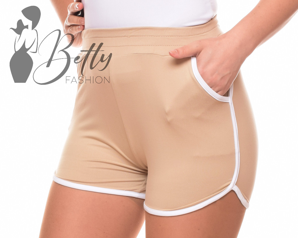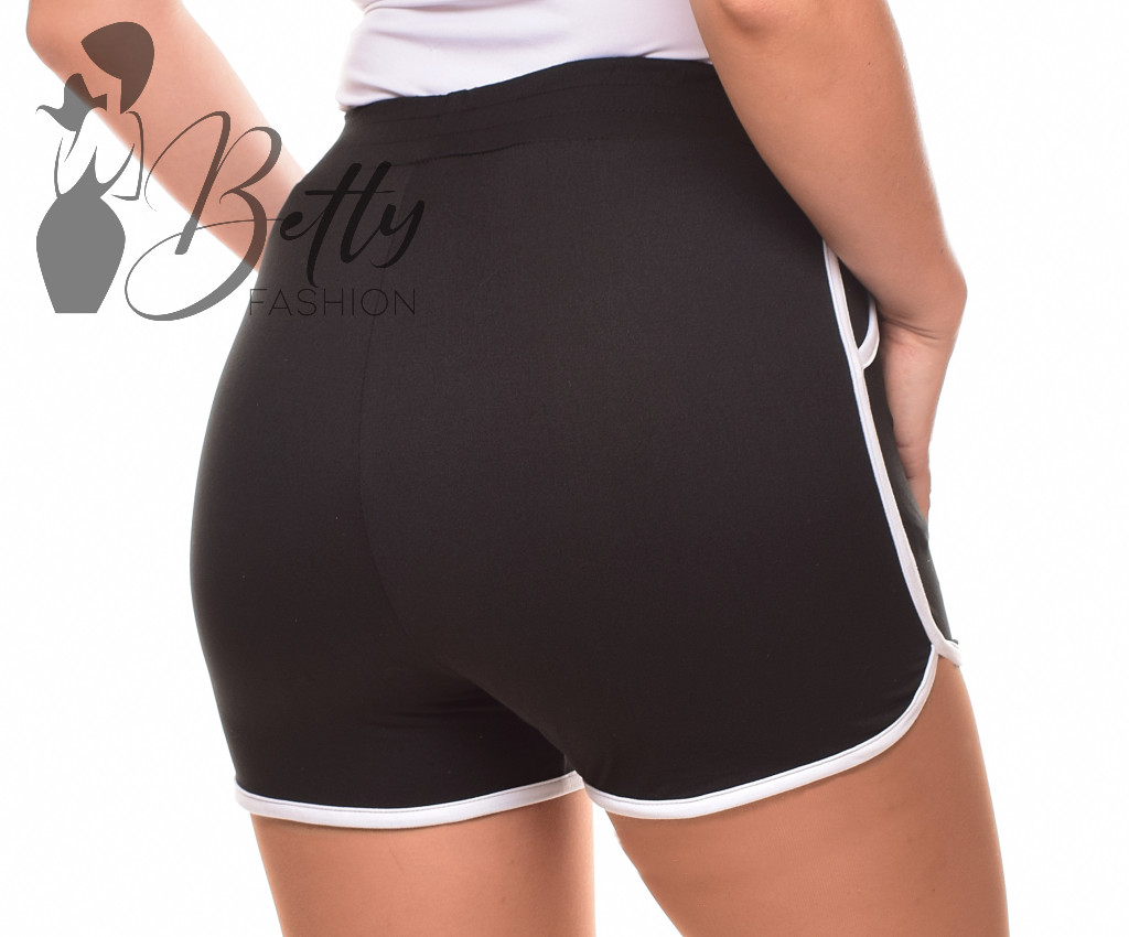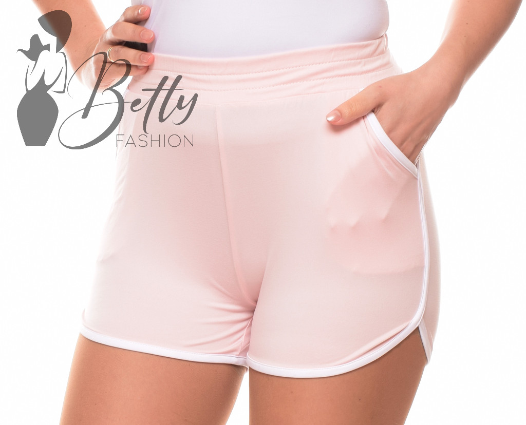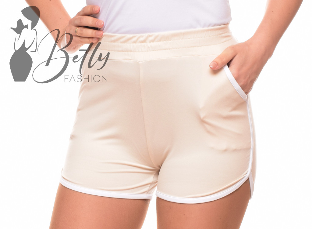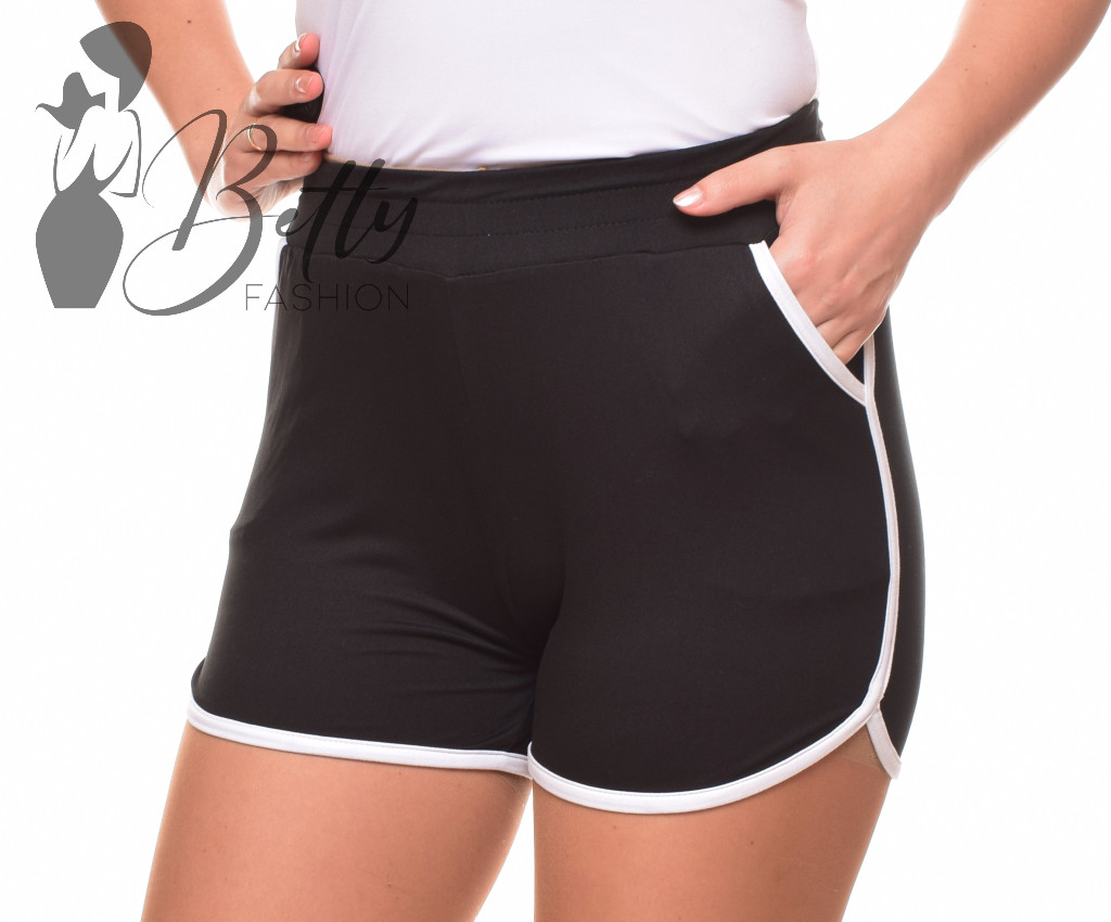 Alul és zsebénél fehér szegélyes, gumis derekú, zsebes rövidnadrág