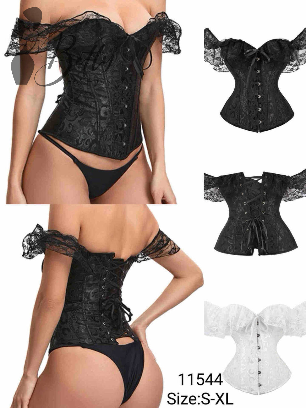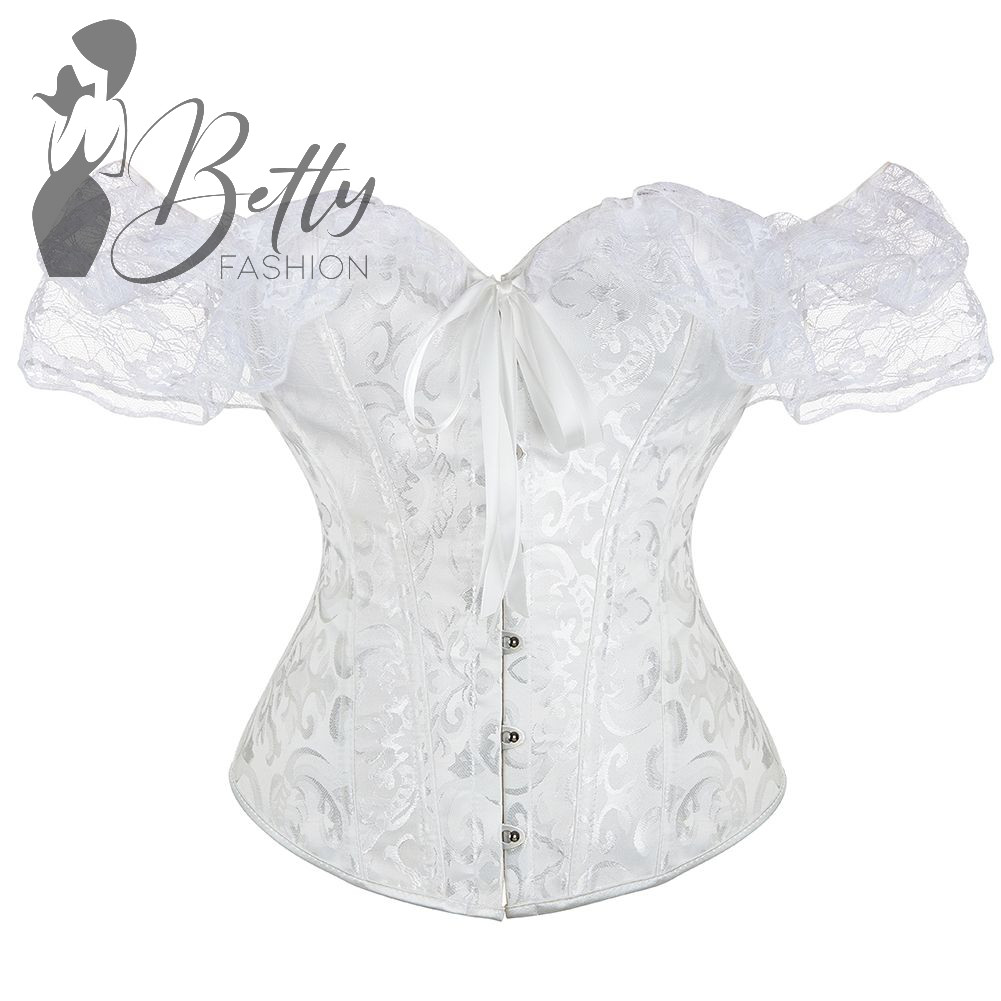 - Elején kapcsos, hátul fűzős, merevítő szálas, brokát mintás fűző, ejtett csipkés vállrésszel