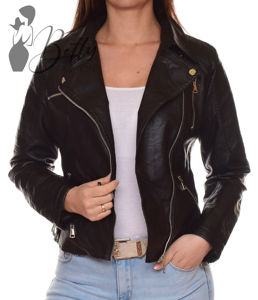 Fekete színű, oldal cipzáros, galléros, műbőr dzseki