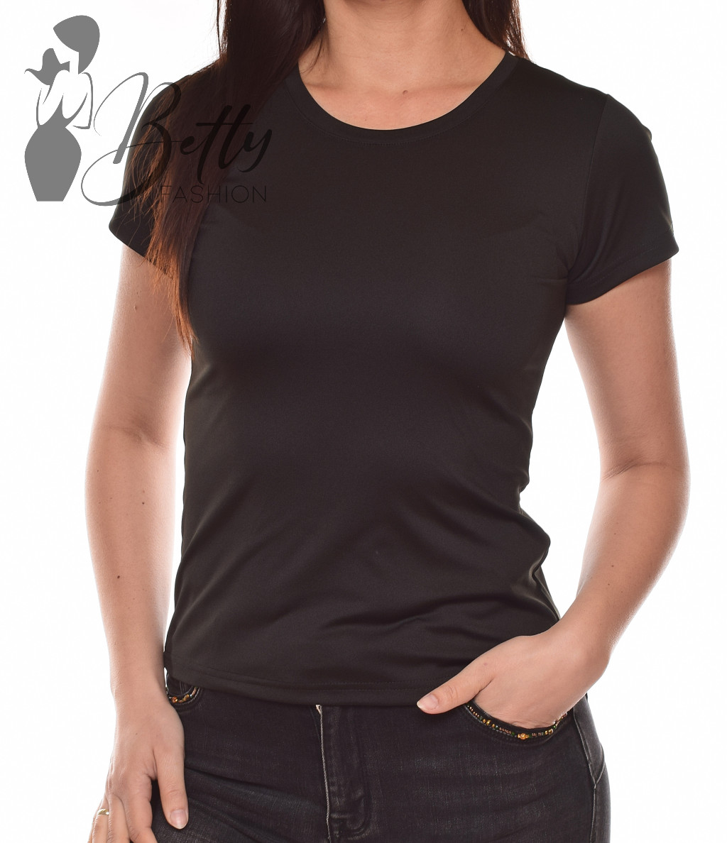 Fekete színű, kerek kivágású, rövid ujjú, selymes anyagú, sportos póló