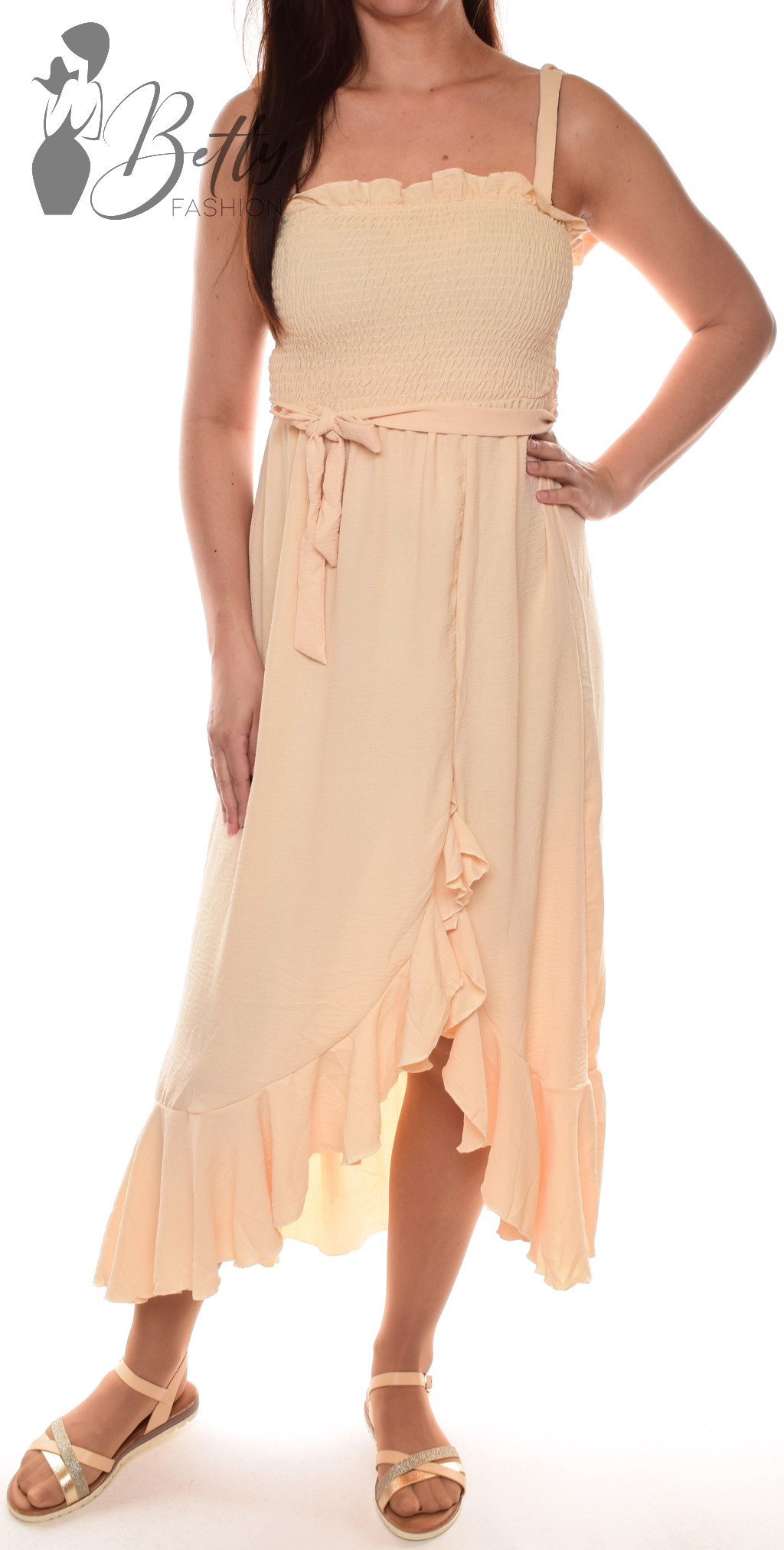 Egyszínű, vállain megkötős, mellnél smokkolt ruha