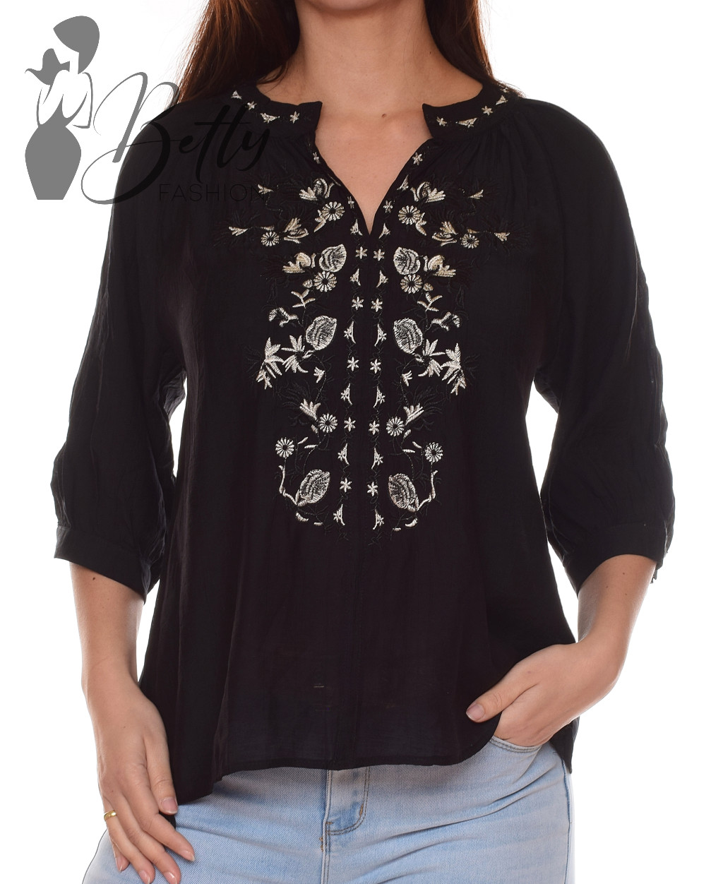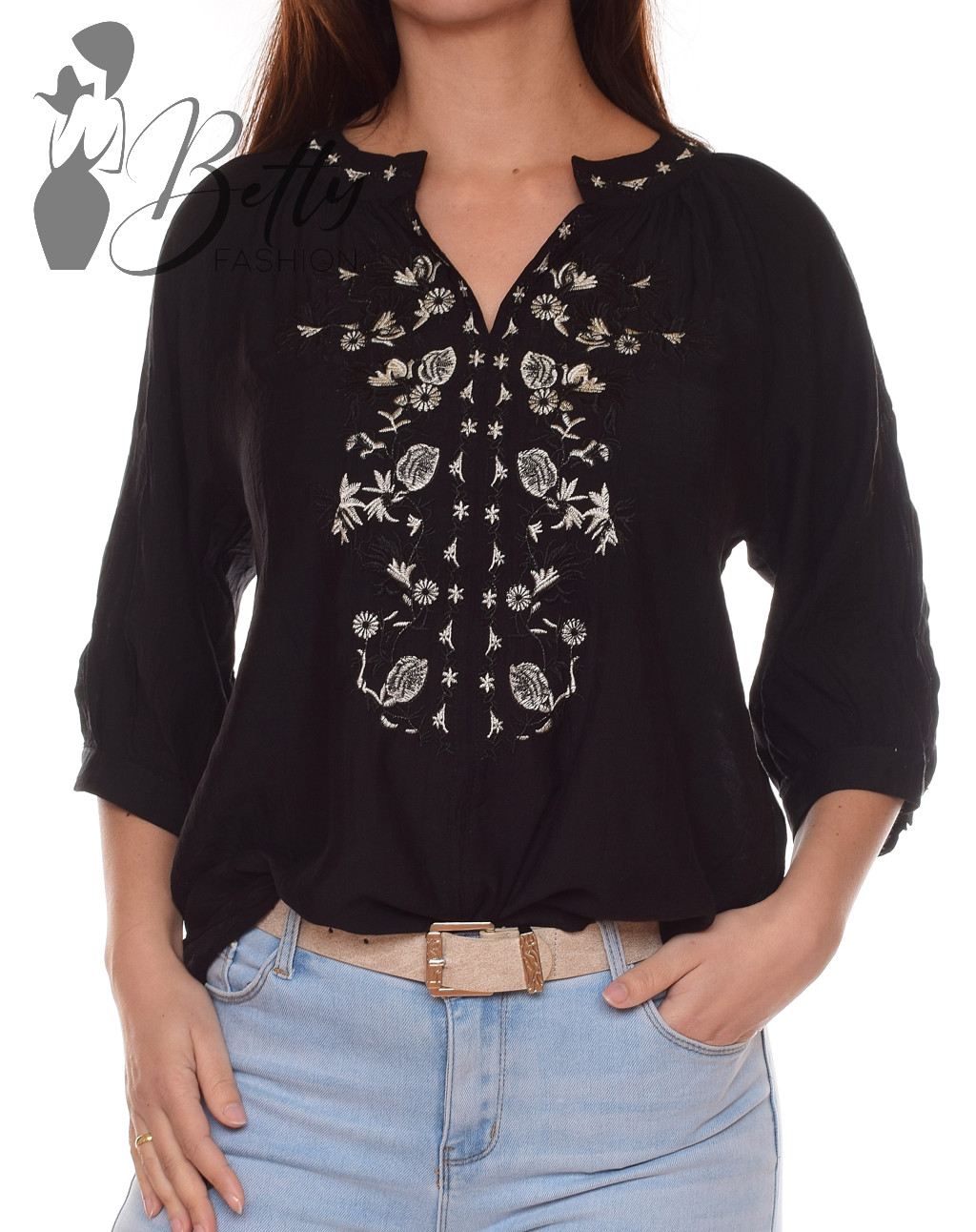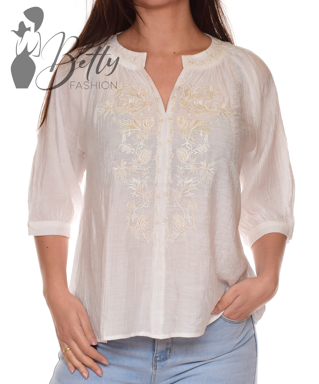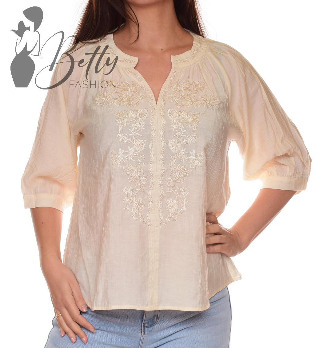 Magasított kerek nyakú, középen kivágott, hímzett virágmintás blúz