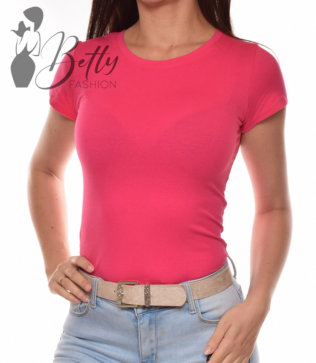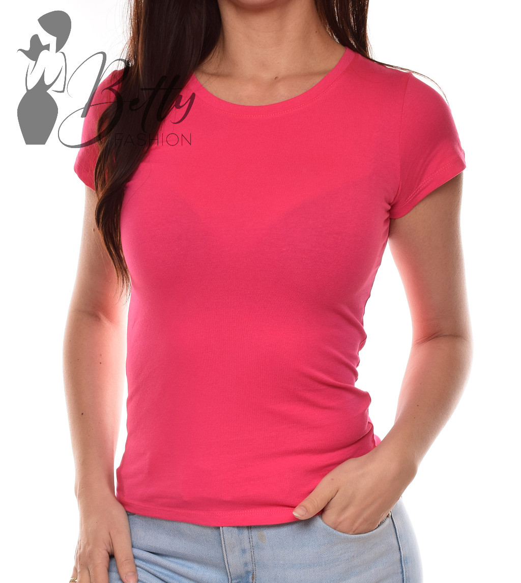 Málnapiros színű, kerek nyakú, rövid ujjú, rugalmas pamut felső