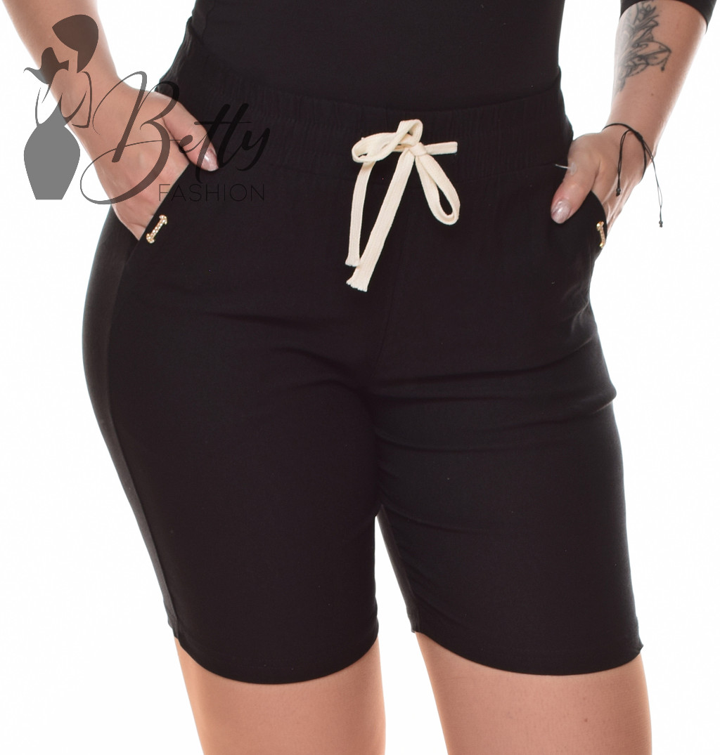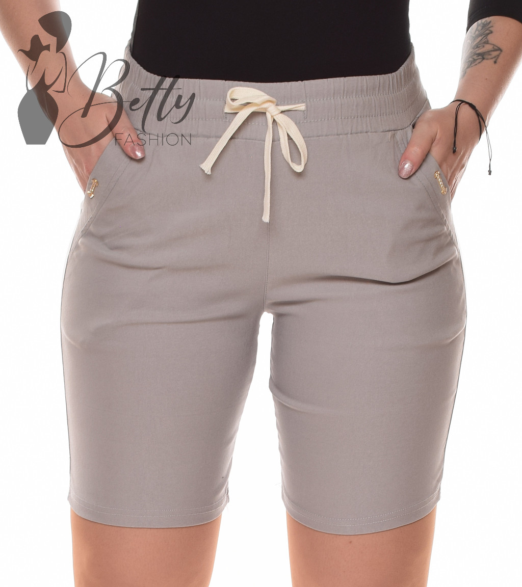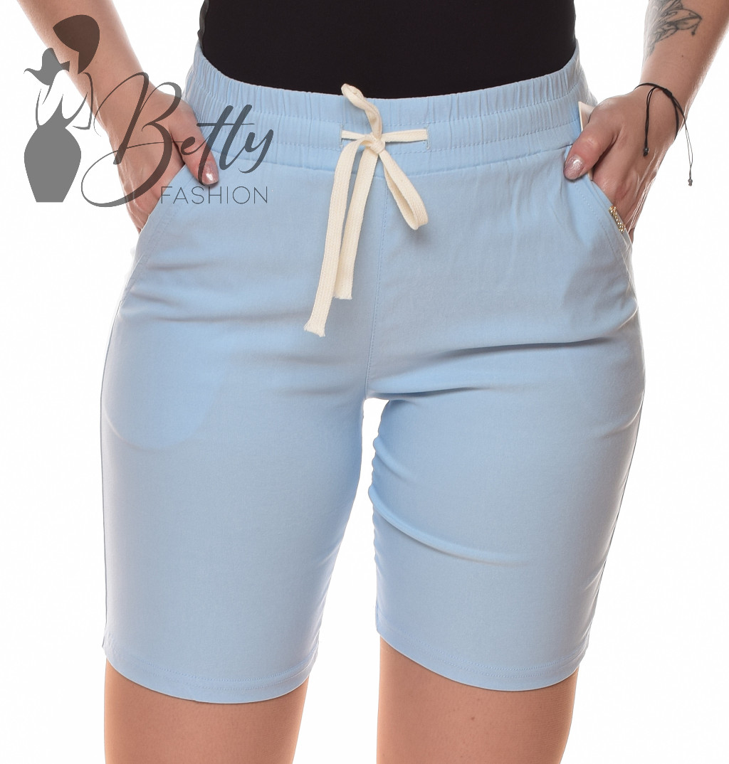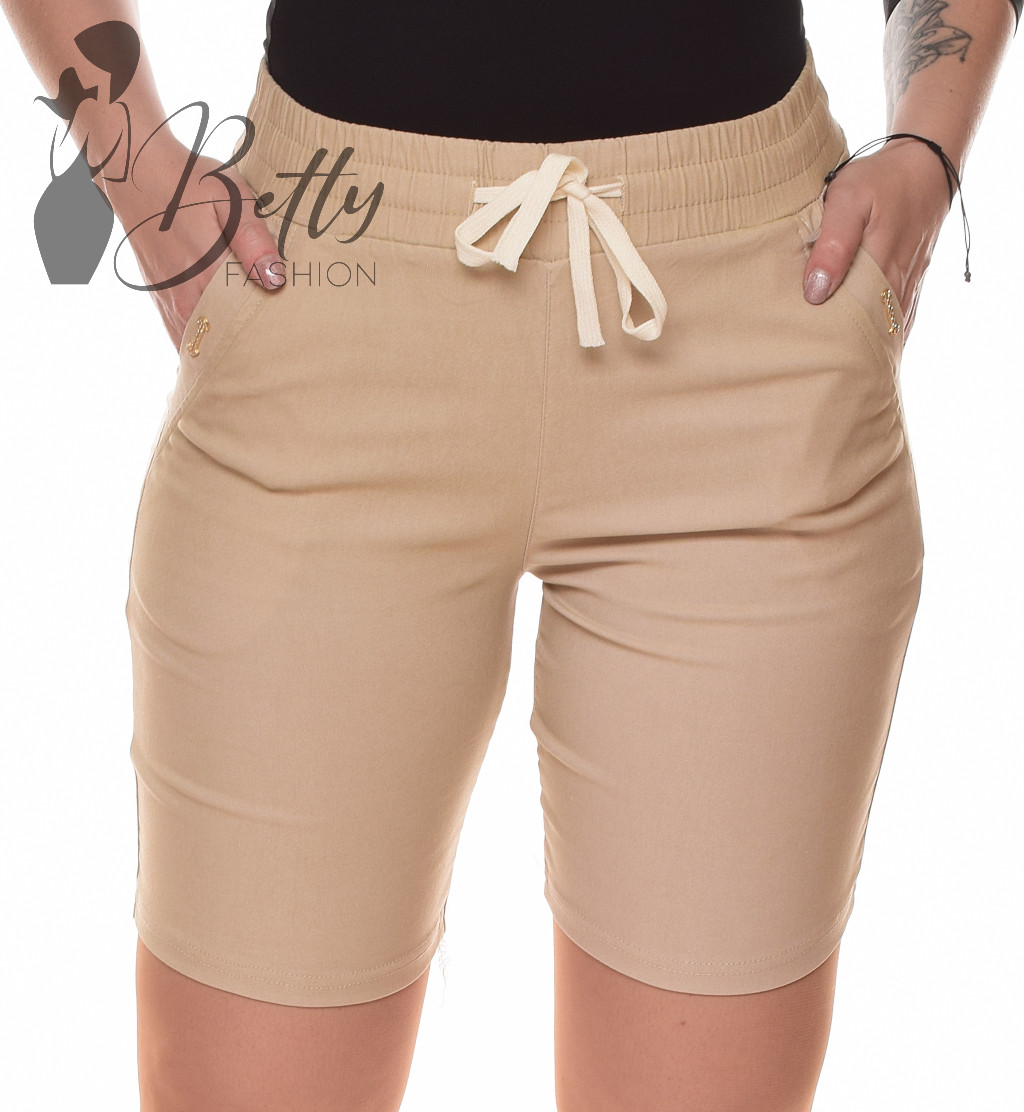 Egyszínű, elől franciazsebes és fémdíszes, gumis és megkötős derekú, sztreccses anyagú rövidnadrág