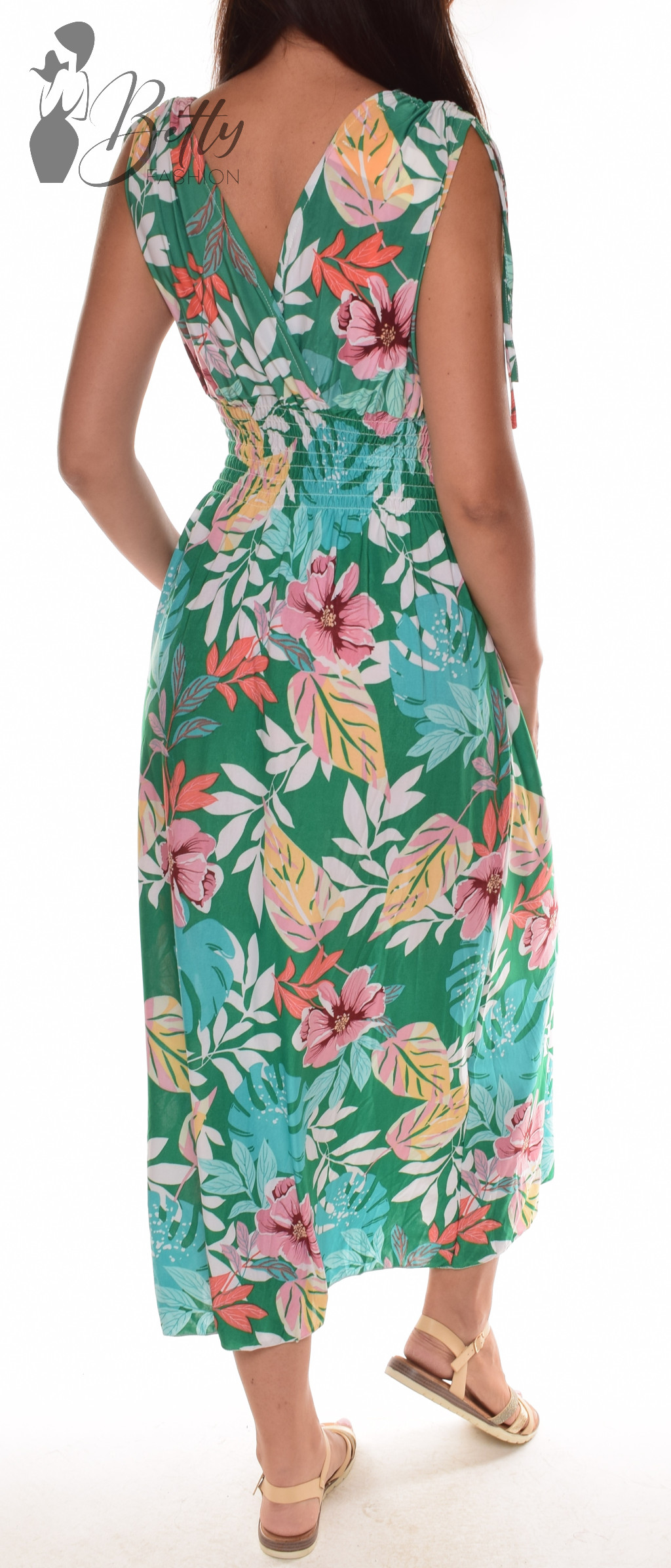 Virágmintás, V-kivágású és átlapolt, derékban gumírozott ruha