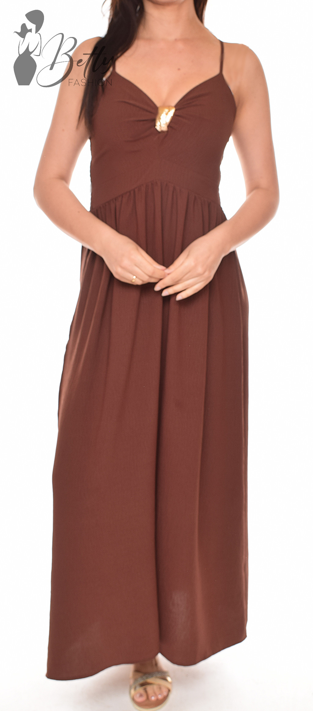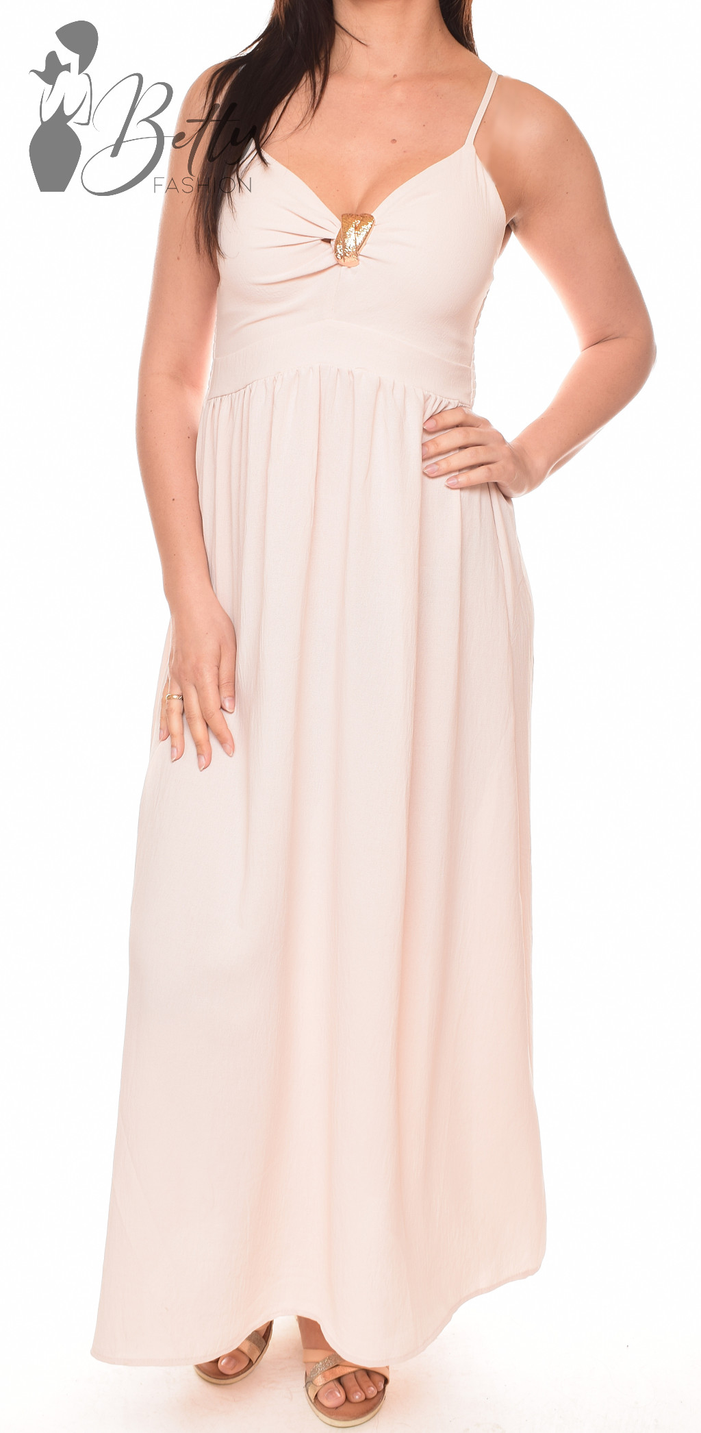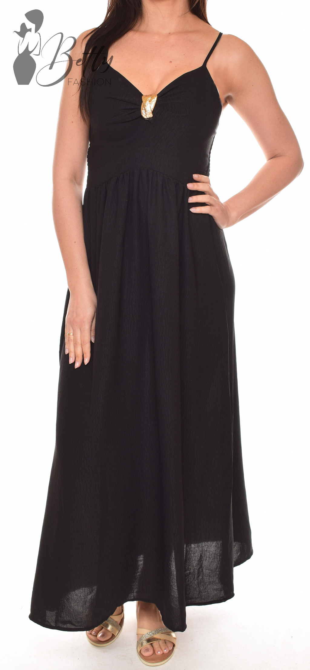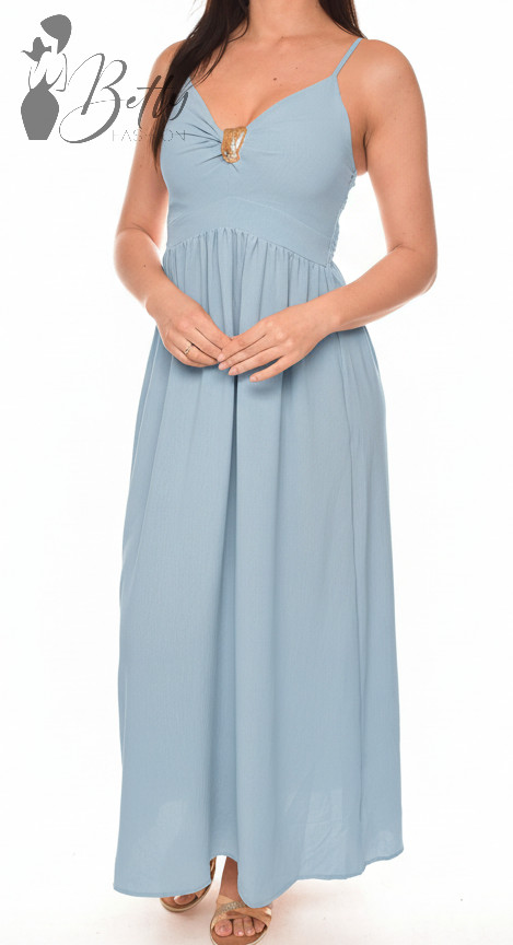 Mellnél fémdíszes és kivágott, állítható spagettipántos maxiruha