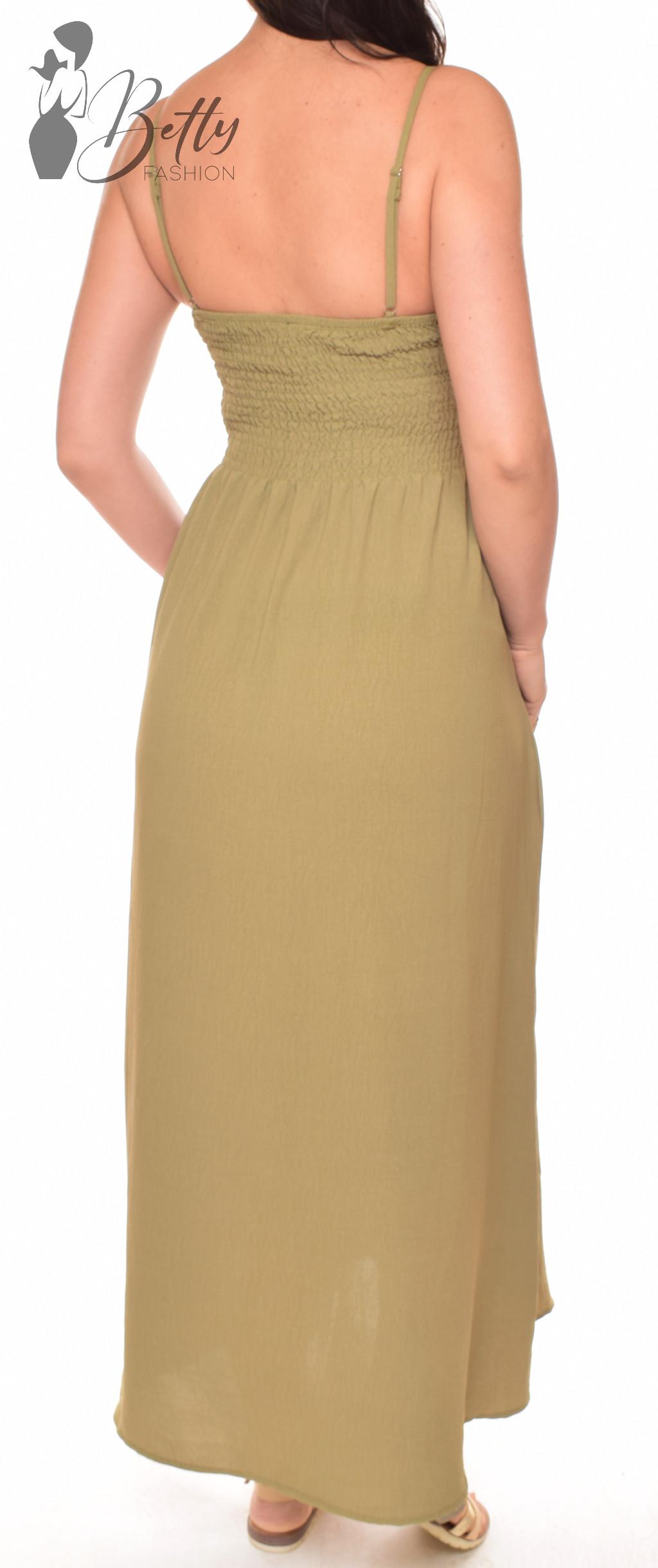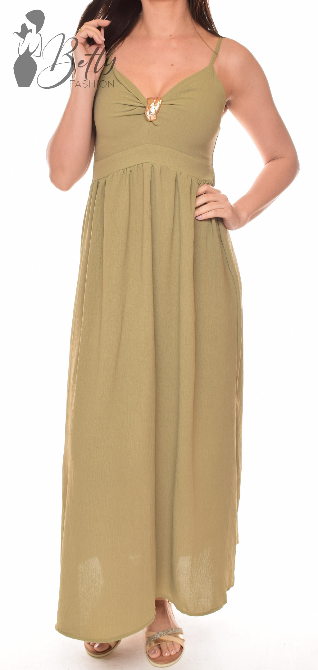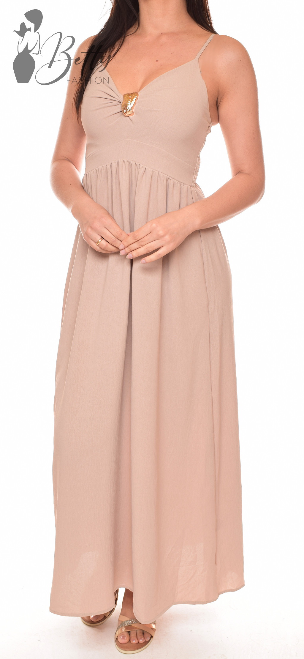 Mellnél fémdíszes és kivágott, állítható spagettipántos maxiruha