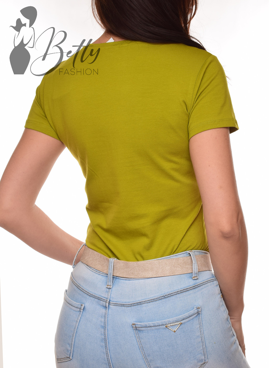 Olajzöld színű, V-kivágású, rövid ujjú, rugalmas pamut felső