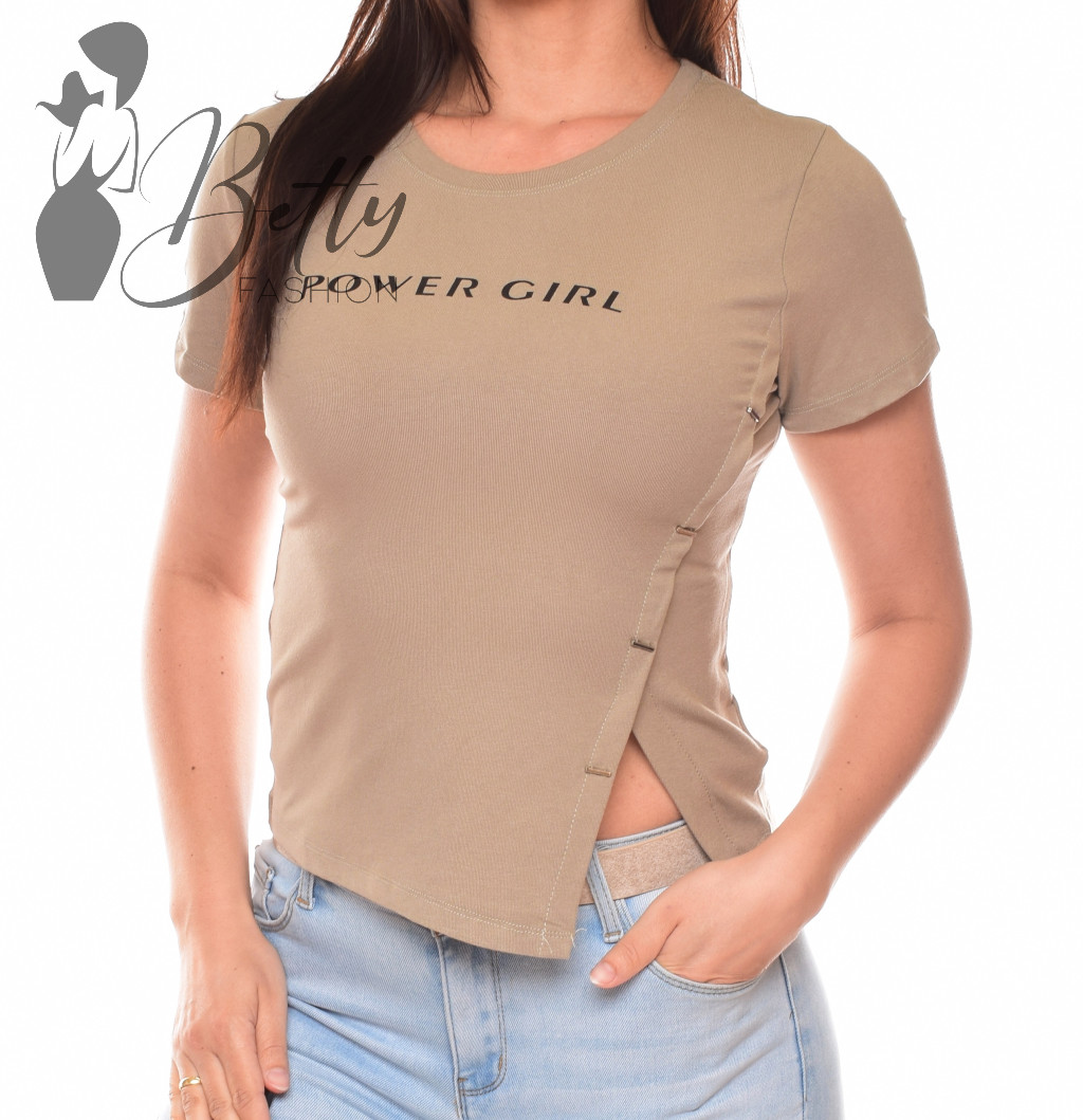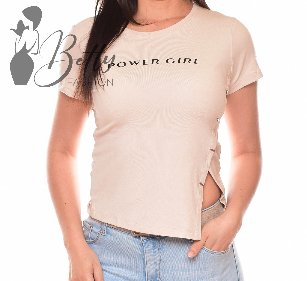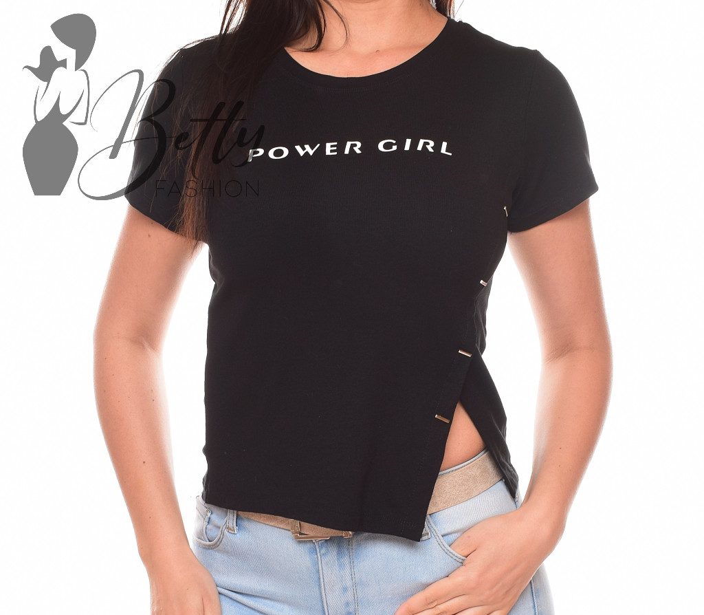 POWER GIRL feliratos, bal oldalt fémdíszes és felsliccelt felső