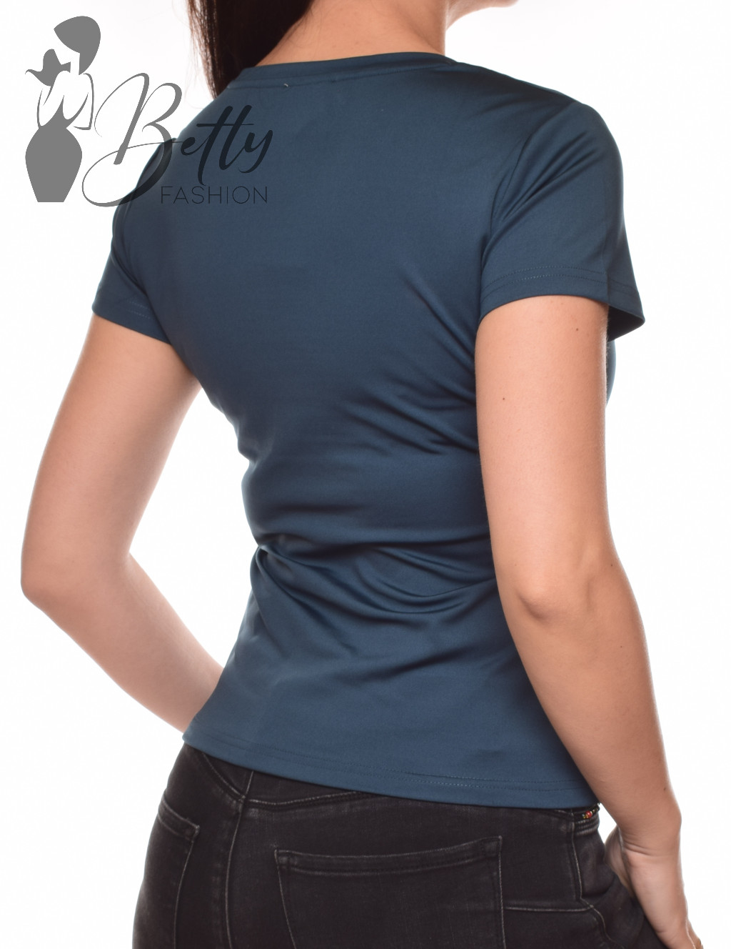 Pávakék színű, kerek kivágású, rövid ujjú, selymes anyagú, sportos póló
