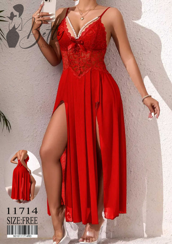 Piros színű, derékig csipkés, gyöngy és masni díszes, alján tüll anyagú, felsliccelt erotikus ruha