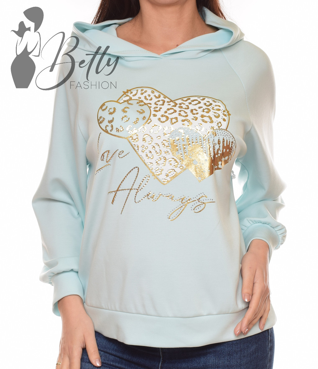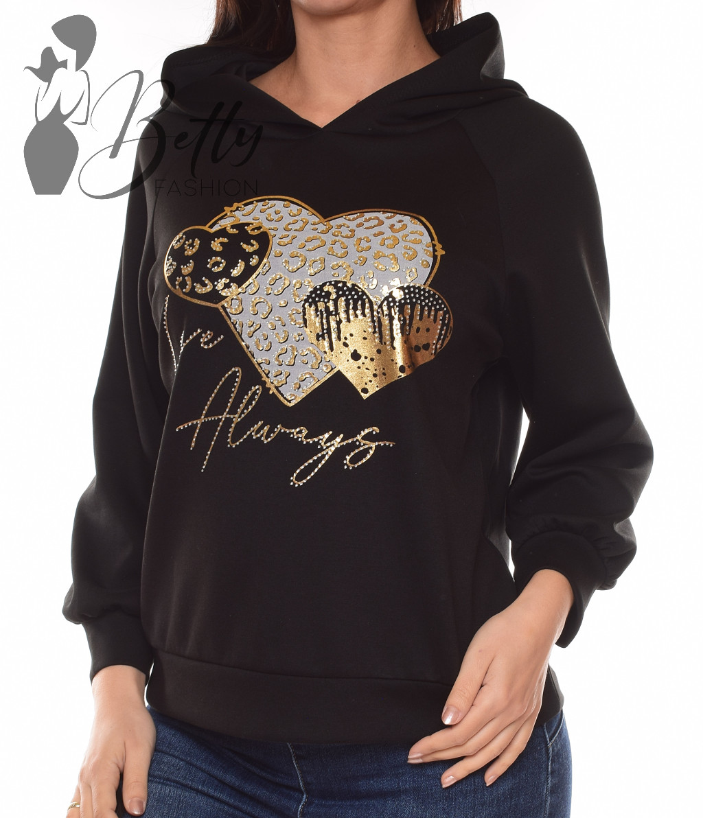 Szív mintás, strasszköves és feliratos, kapucnis pulóver