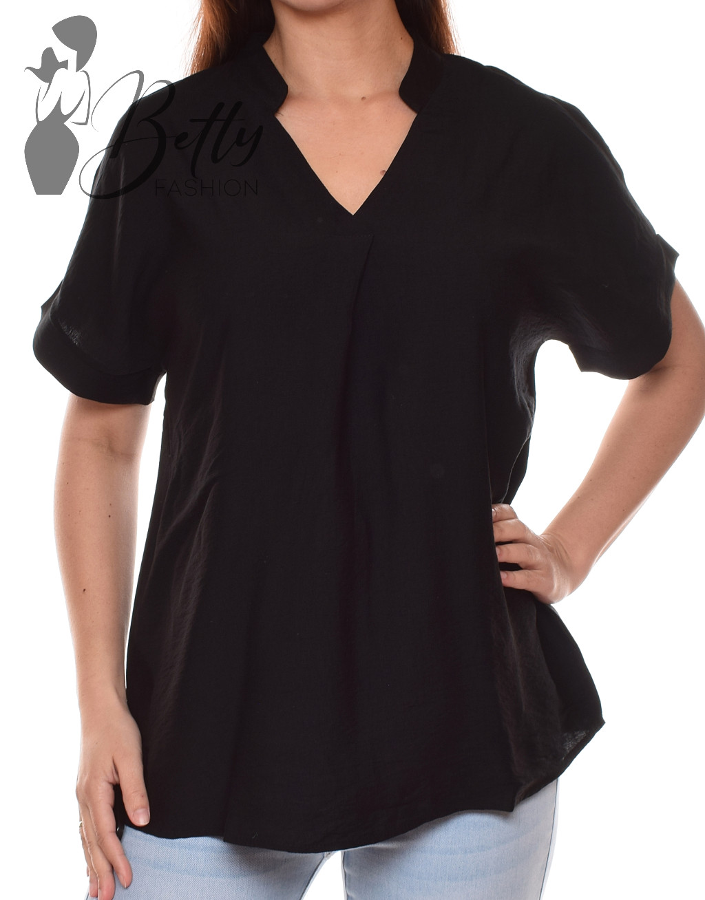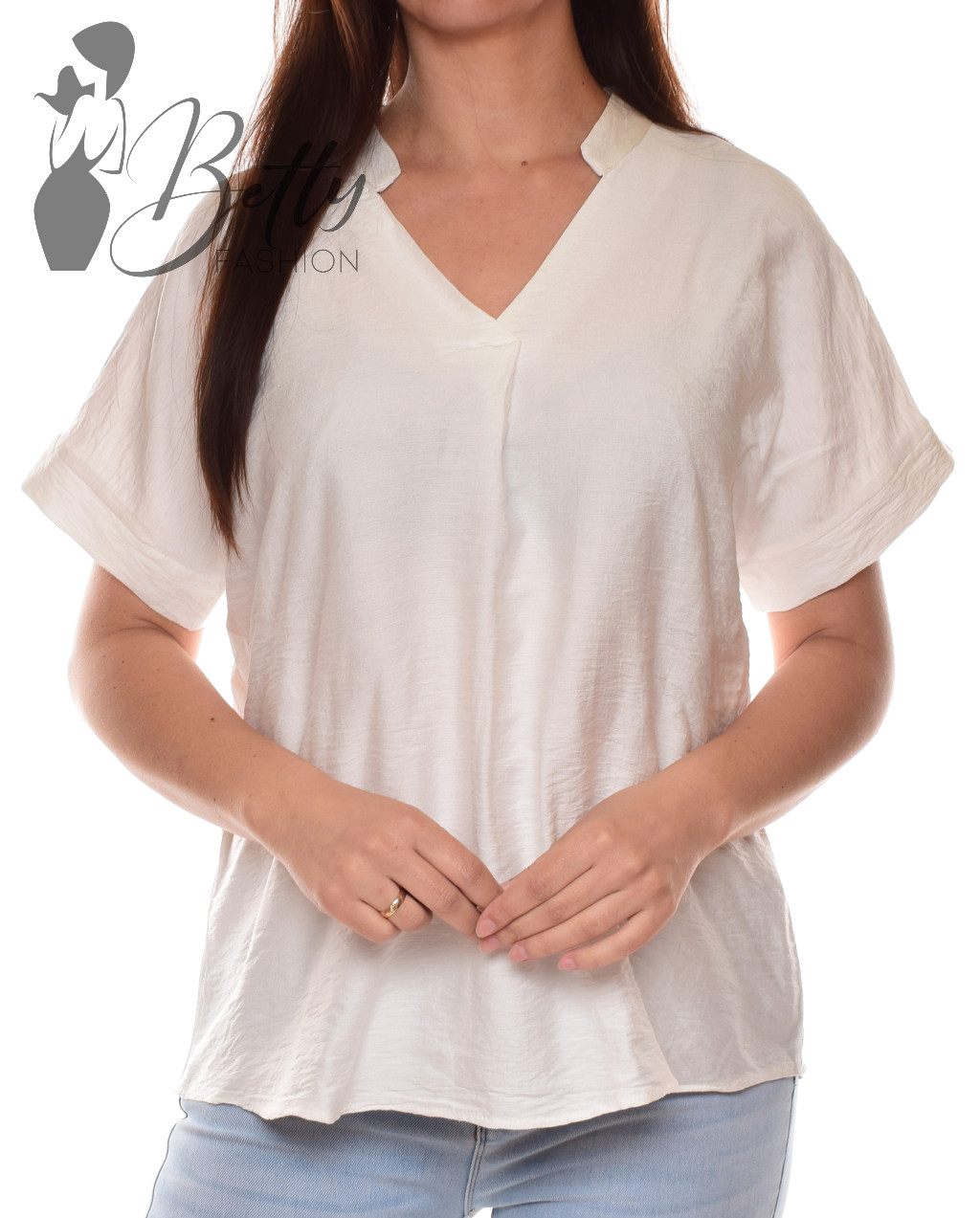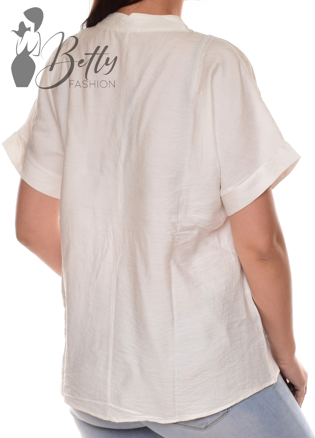 Álló galléros, V-kivágású, bő szabású, rövid ujjú blúz