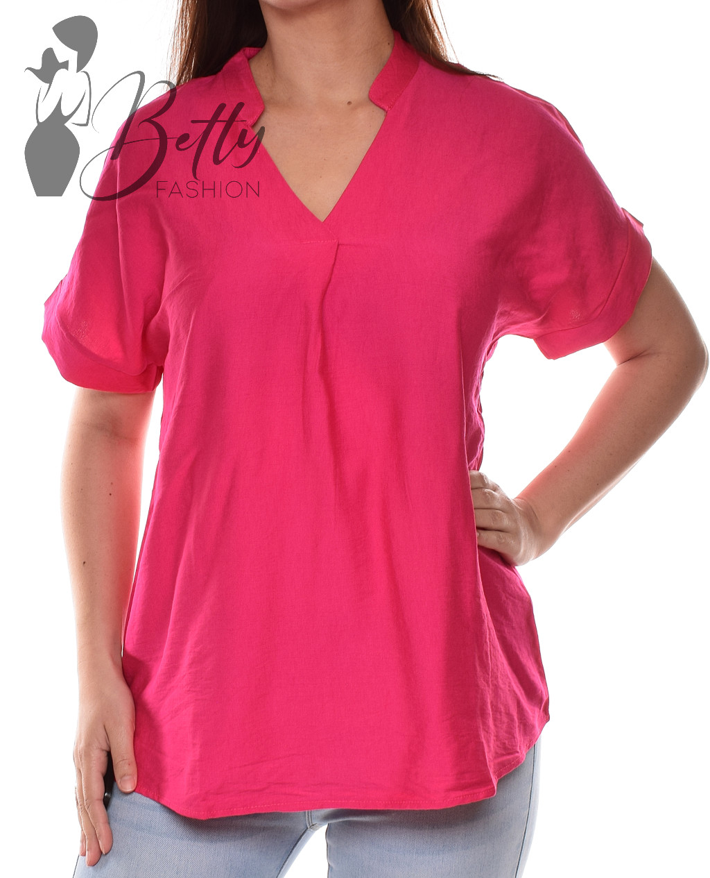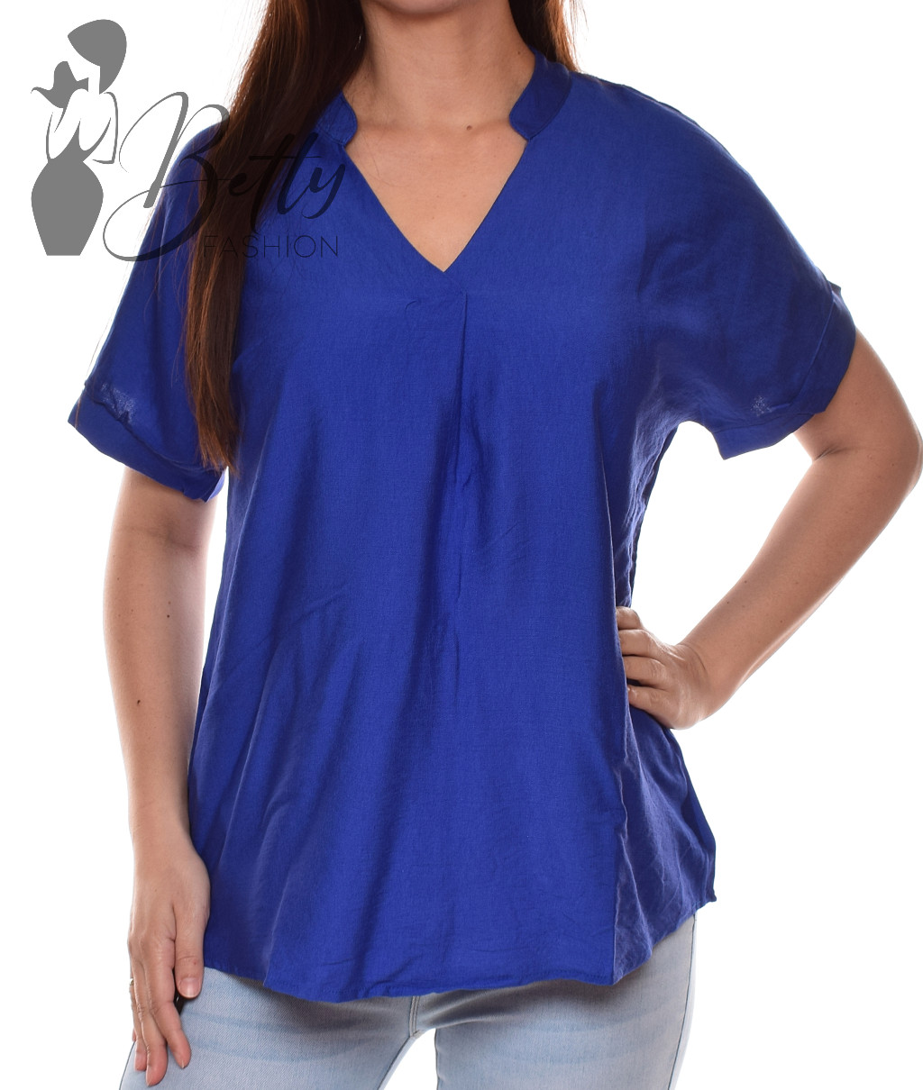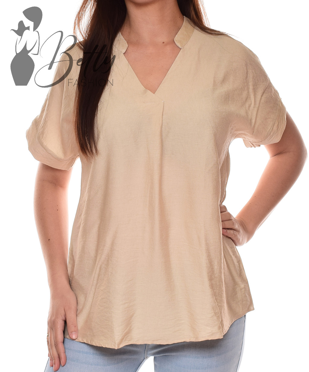 Álló galléros, V-kivágású, bő szabású, rövid ujjú blúz