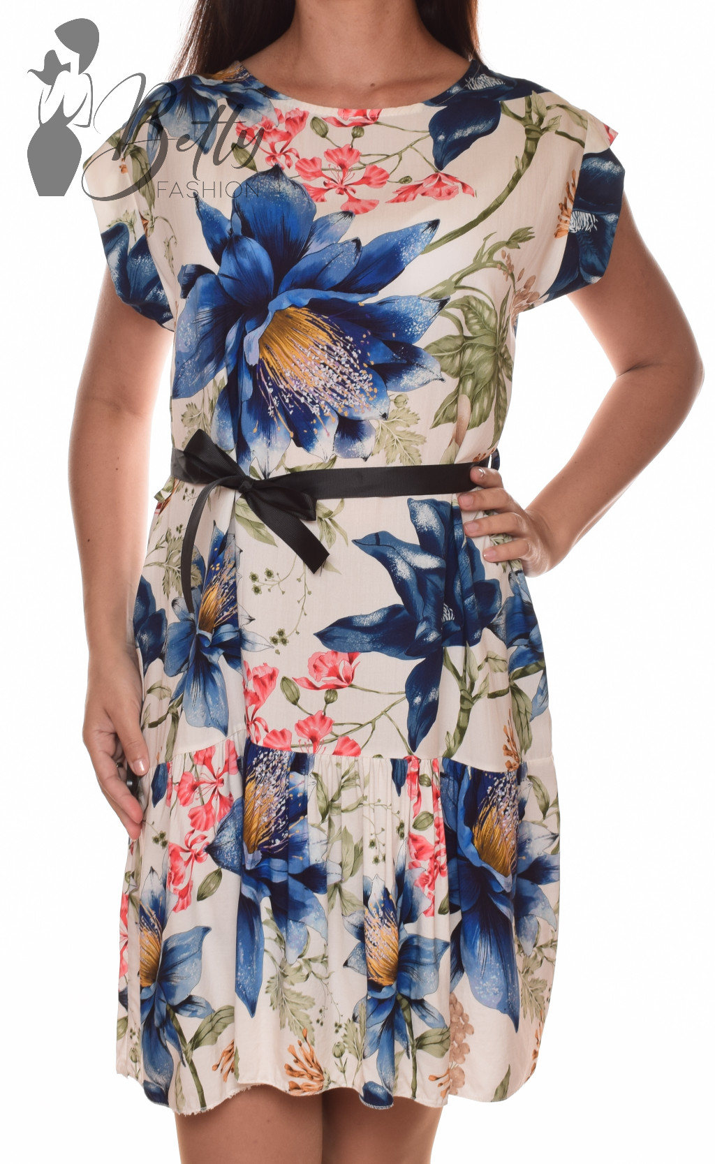 Kerek nyakú, rövid ujjú, szatén öves, fodros aljú ruha