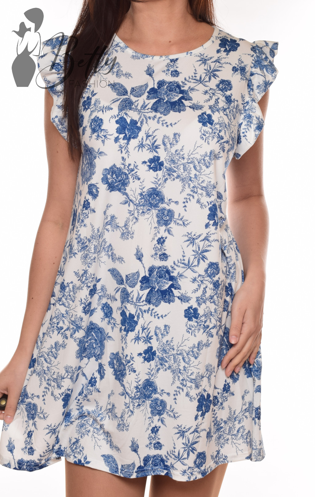 Virágmintás, rövid fodros ujjú, A-vonalú ruha