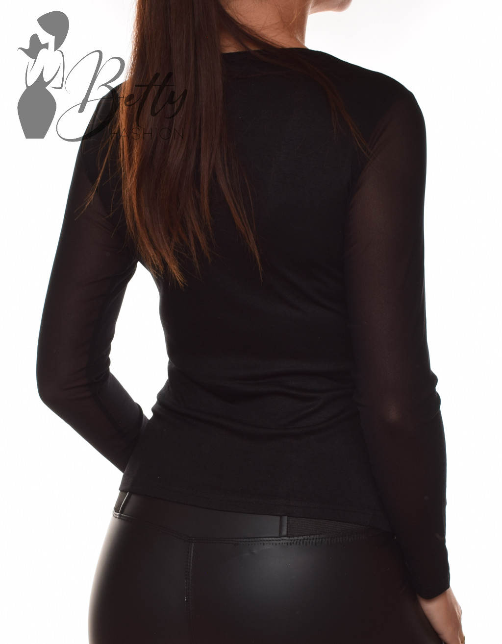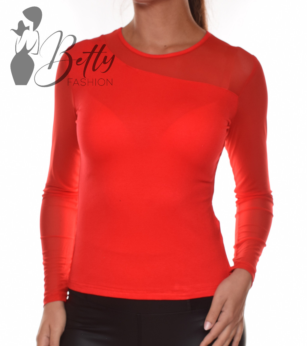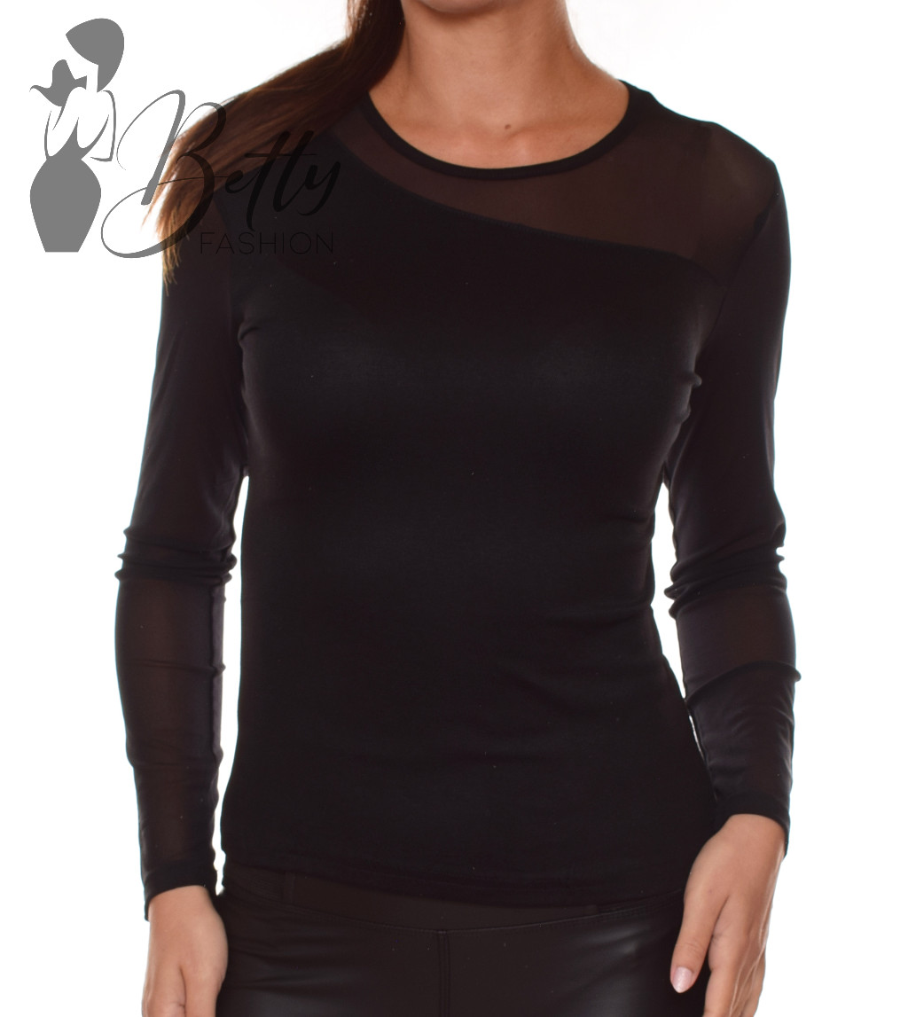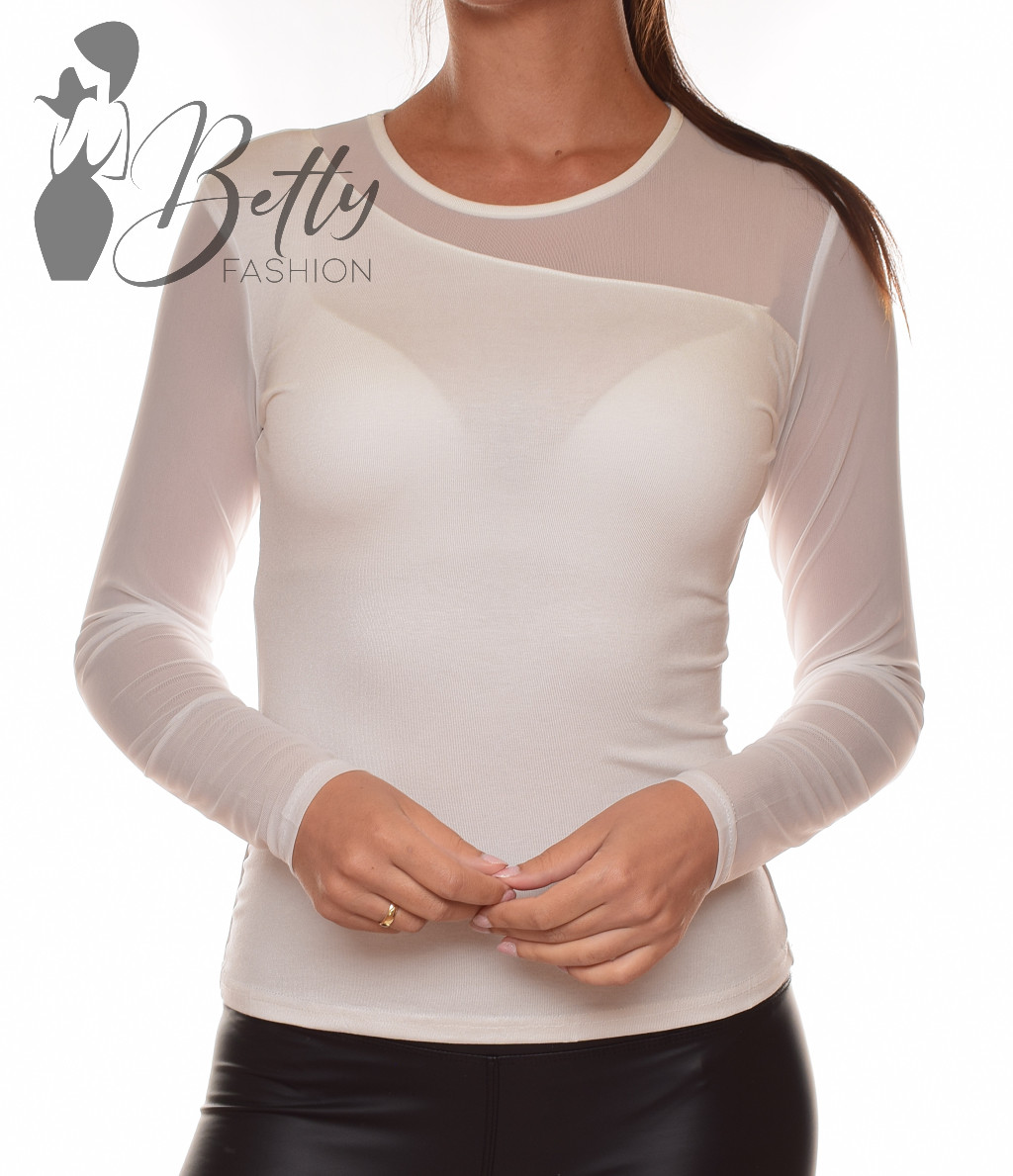 • Egyszínű, kerek nyakú, mellnél átlósan tüllbetétes felső