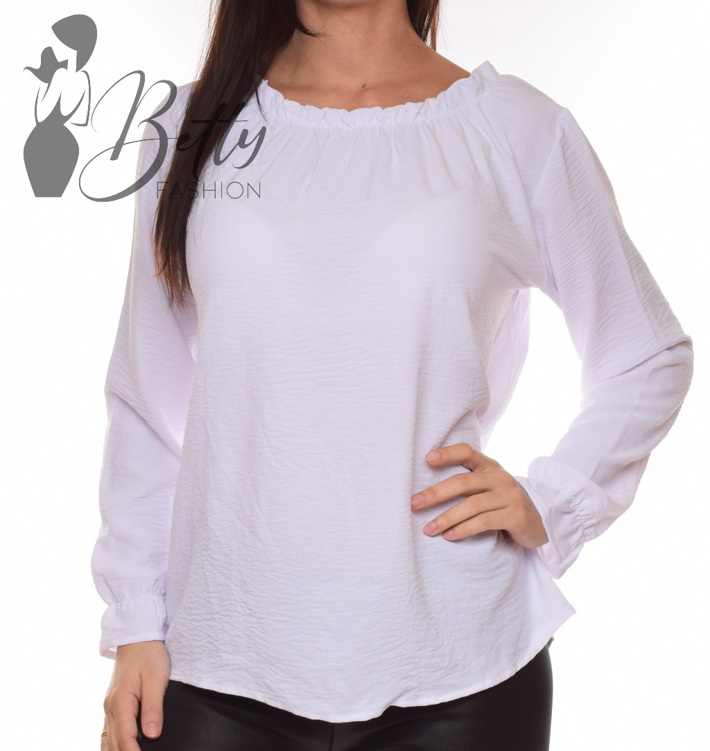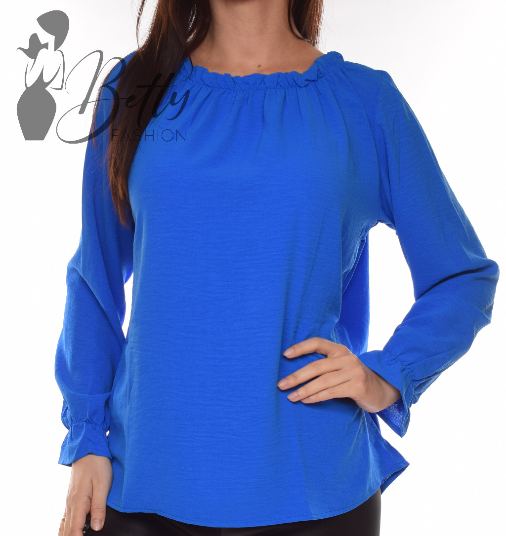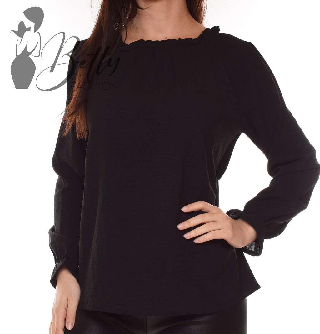 • Lenge fazonú, nyakánál és ujja végén gumis és fodros felső/blúz