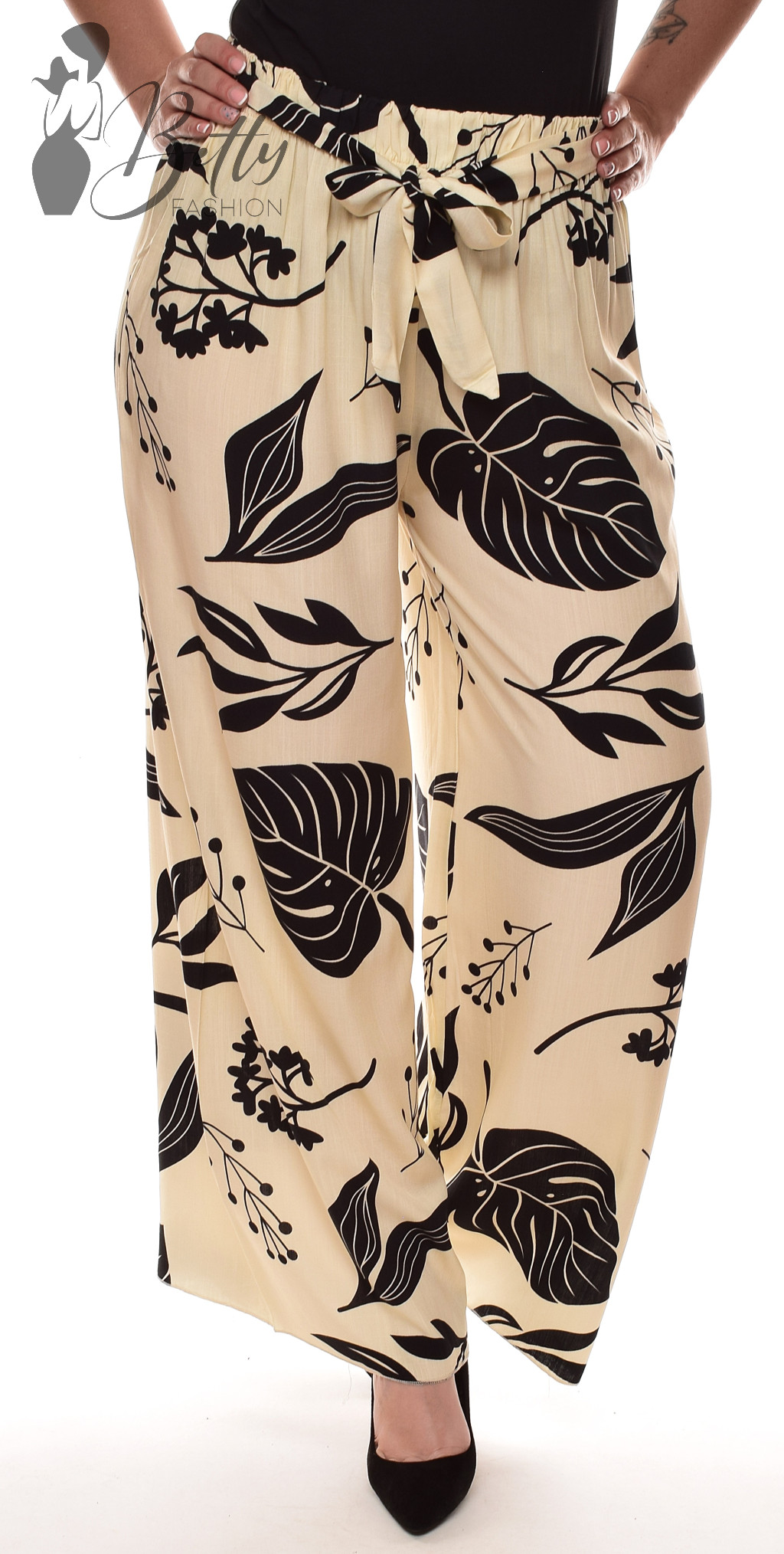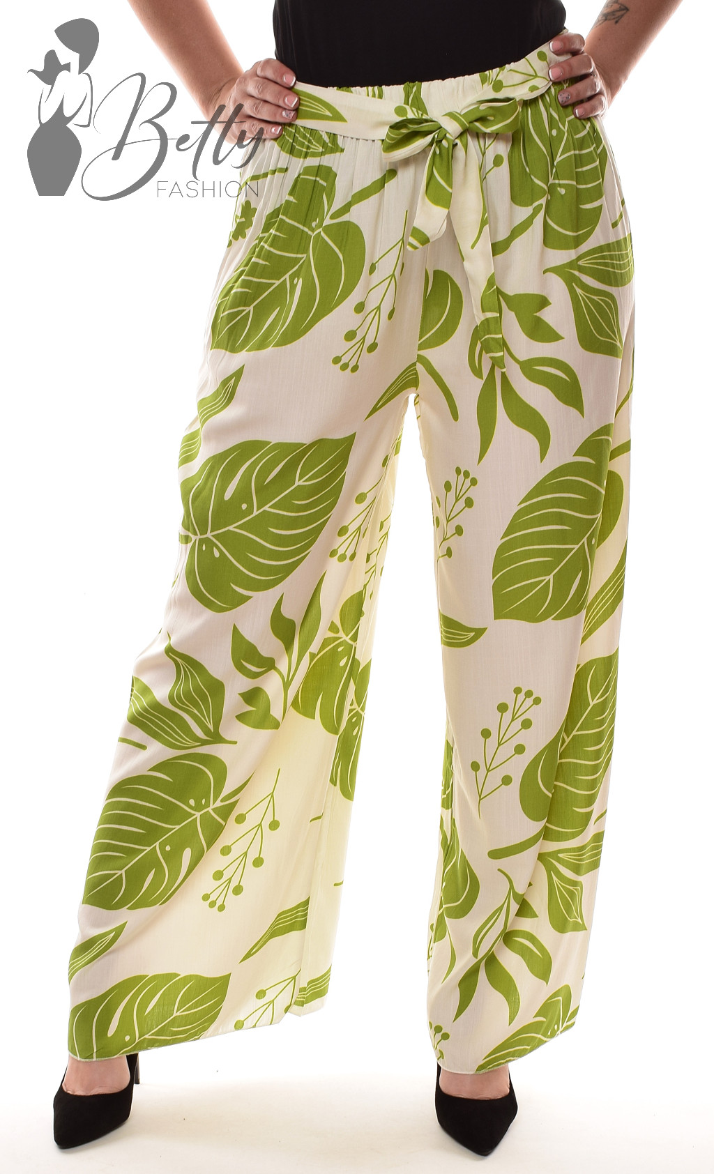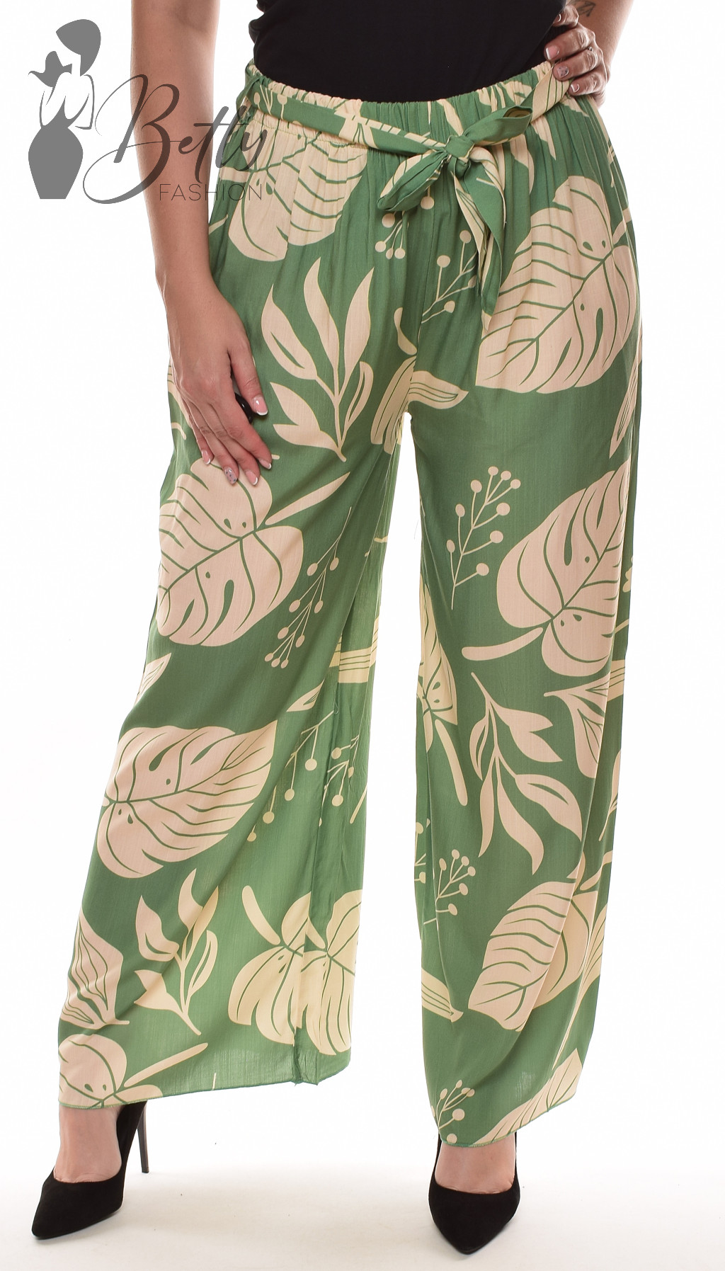 • Trópusi levlé mintás, gumis derekú, saját anyagából öves, bő szárú nadrág