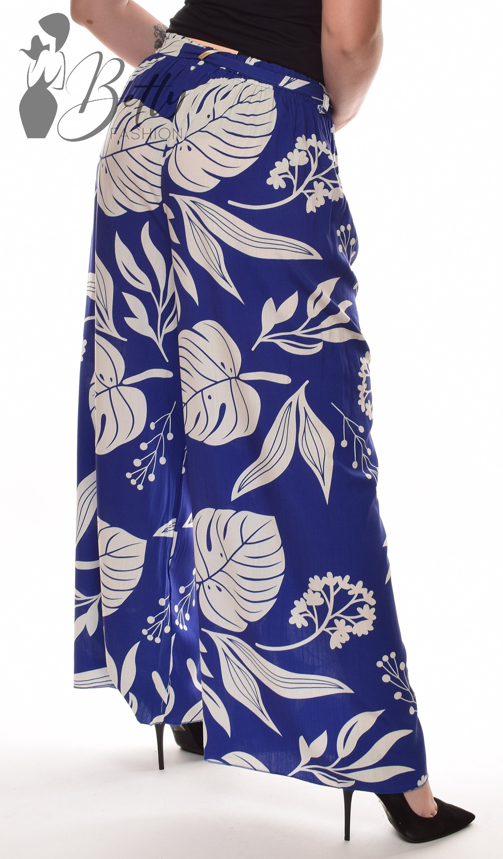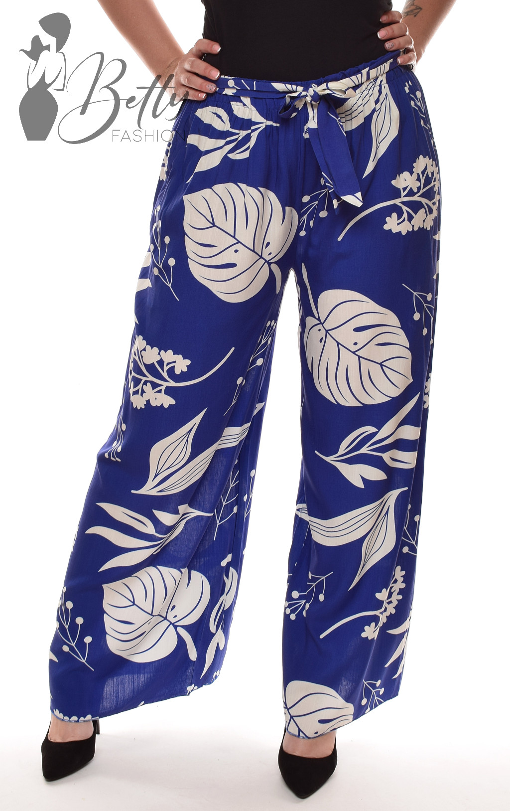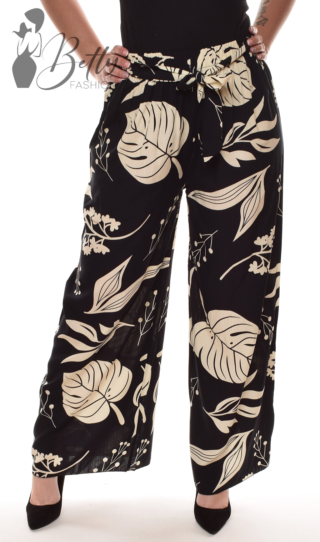 • Trópusi levlé mintás, gumis derekú, saját anyagából öves, bő szárú nadrág