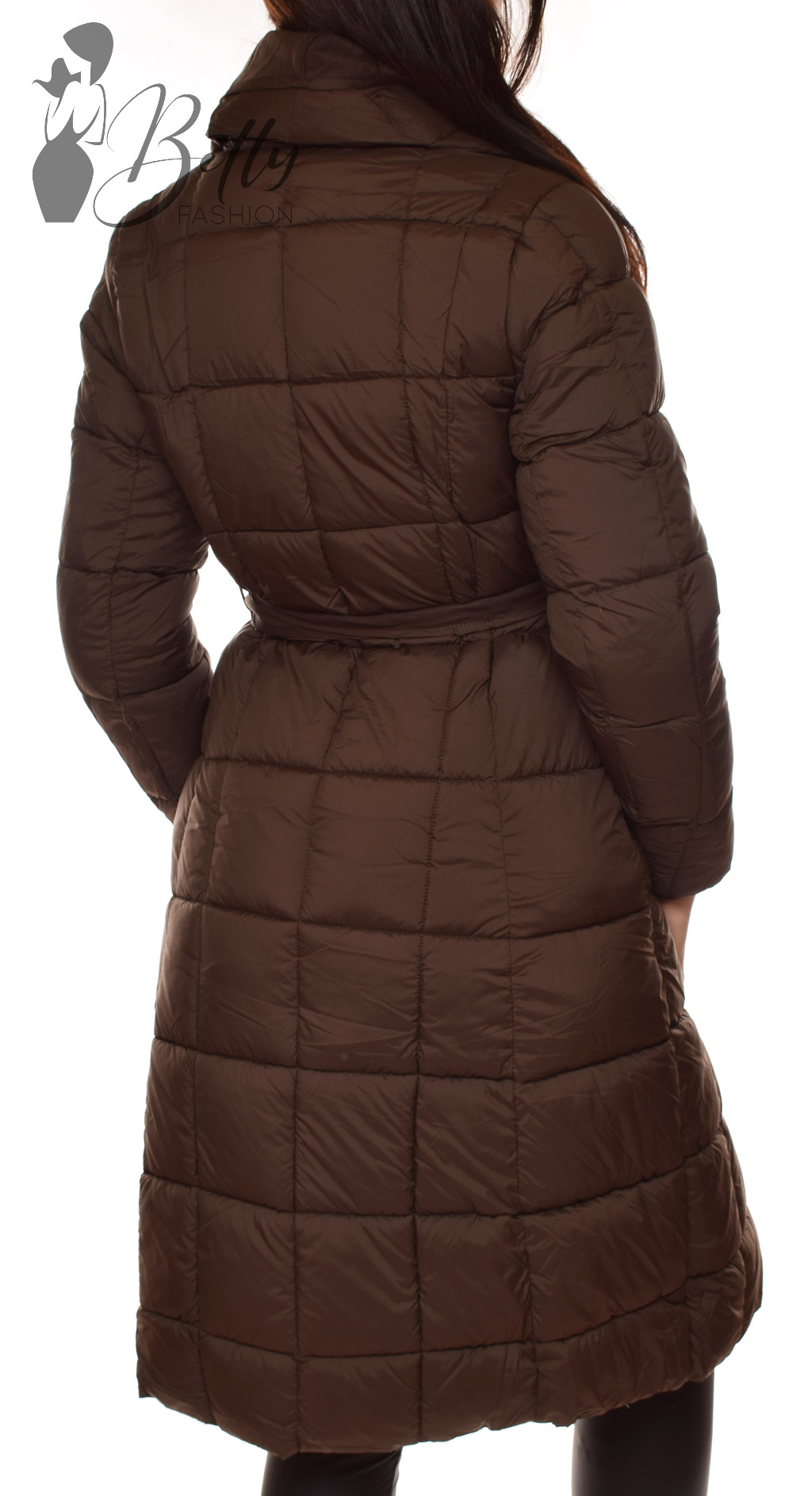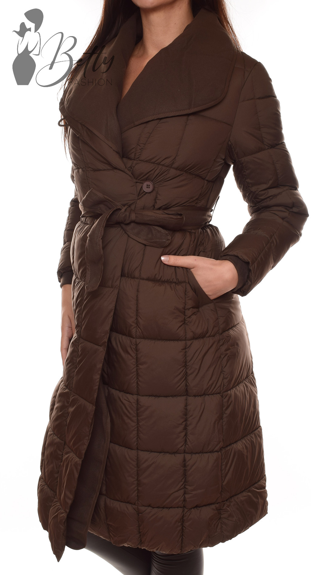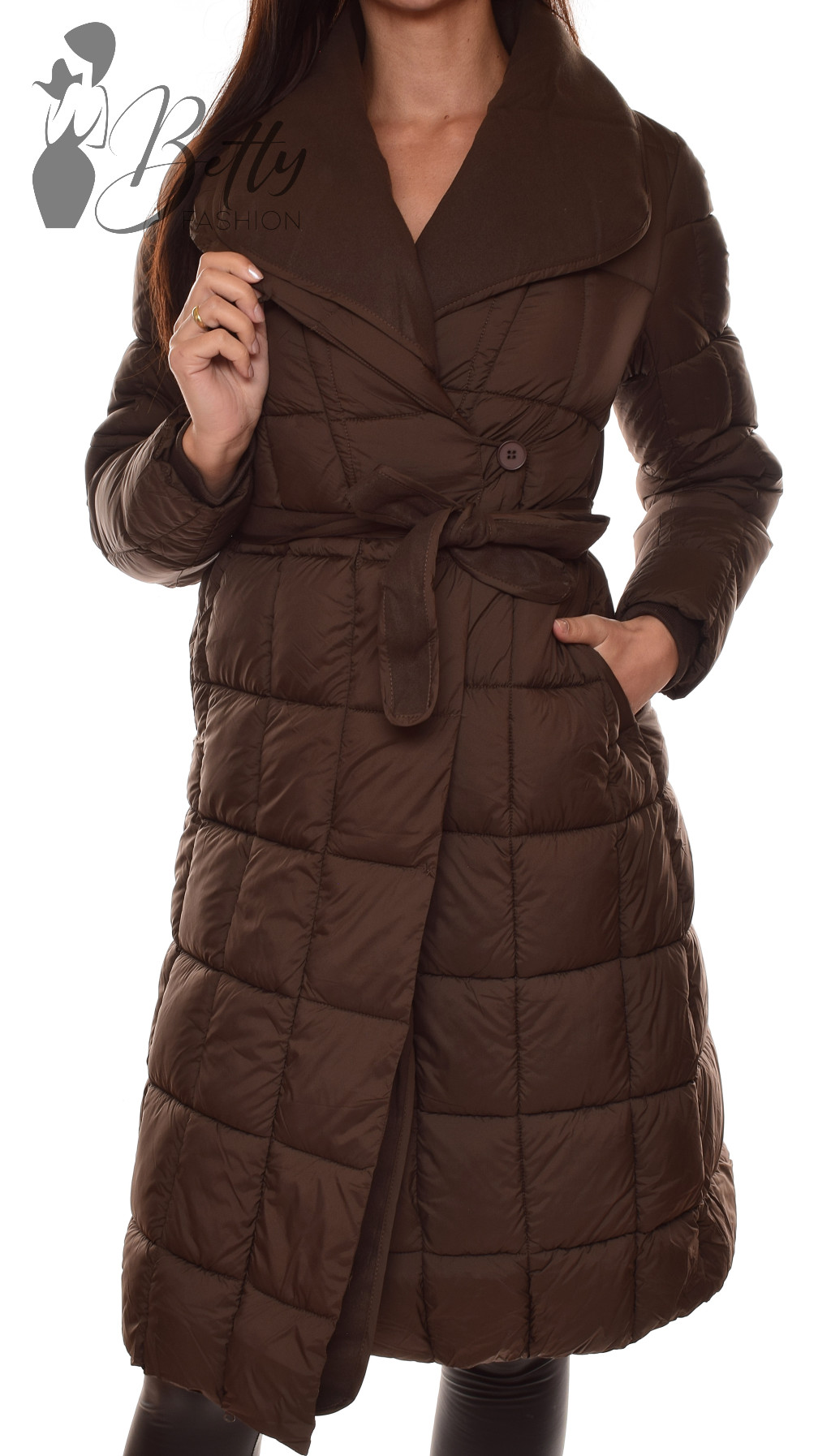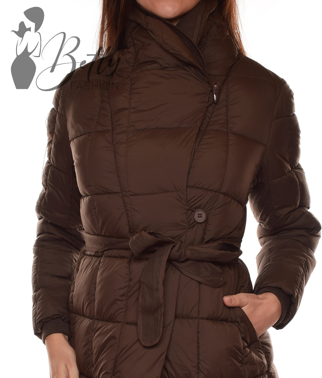 • Sötétbarna színű, széles galléros télikabát