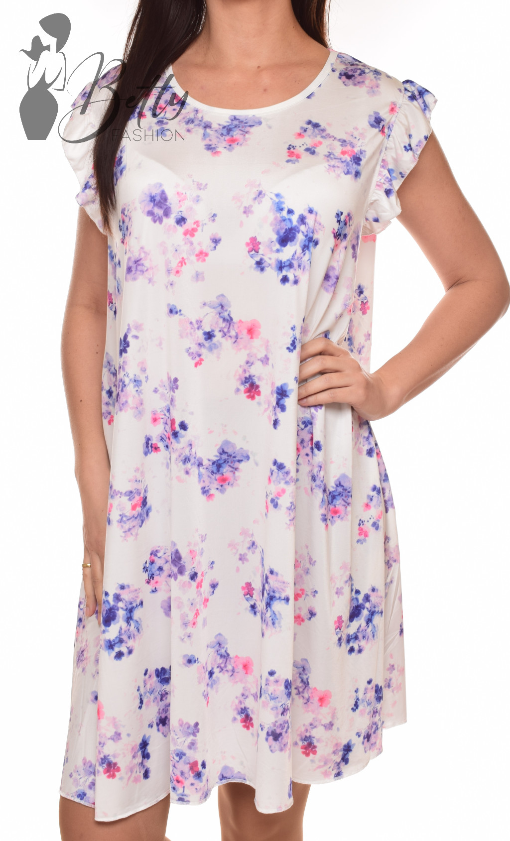 • Virágmintás, fodros ujjú, A-vonalú, bő szabású ruha