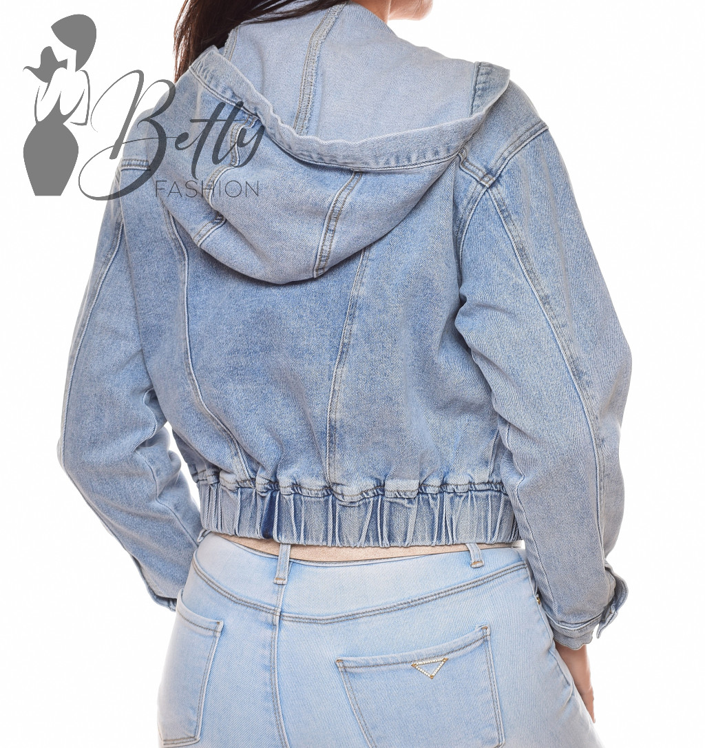 • Kapucnis, cipzáros záródású, mellnél zsebes, alján gumírozott farmerdzseki