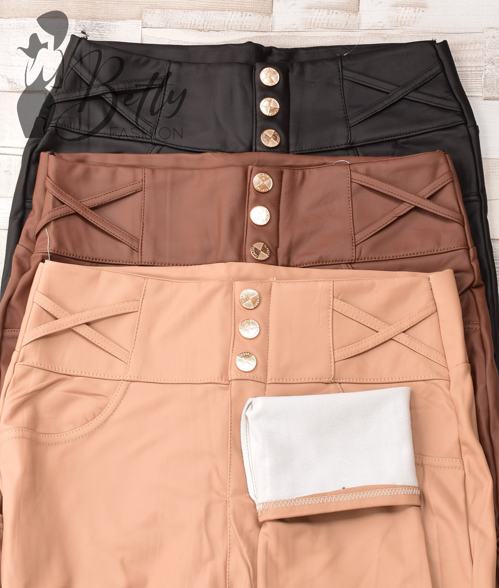 • Gumis derekú, két oldalt díszgombos, műbőr nadrág