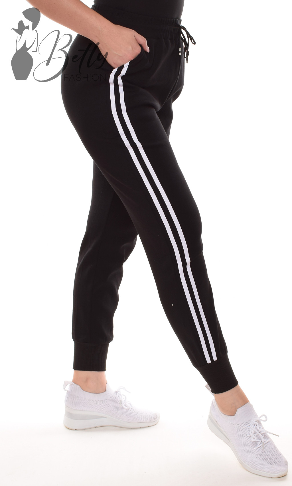 • Fekete színű, oldalt dupla csíkos, gumis és megkötős derekú melegítő nadrág