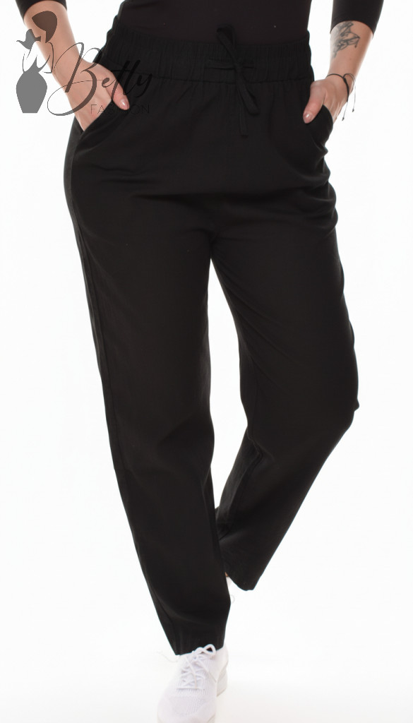 • Laza fazonú, gumis és megkötős derekú, lenvászon anyagú nadrág
