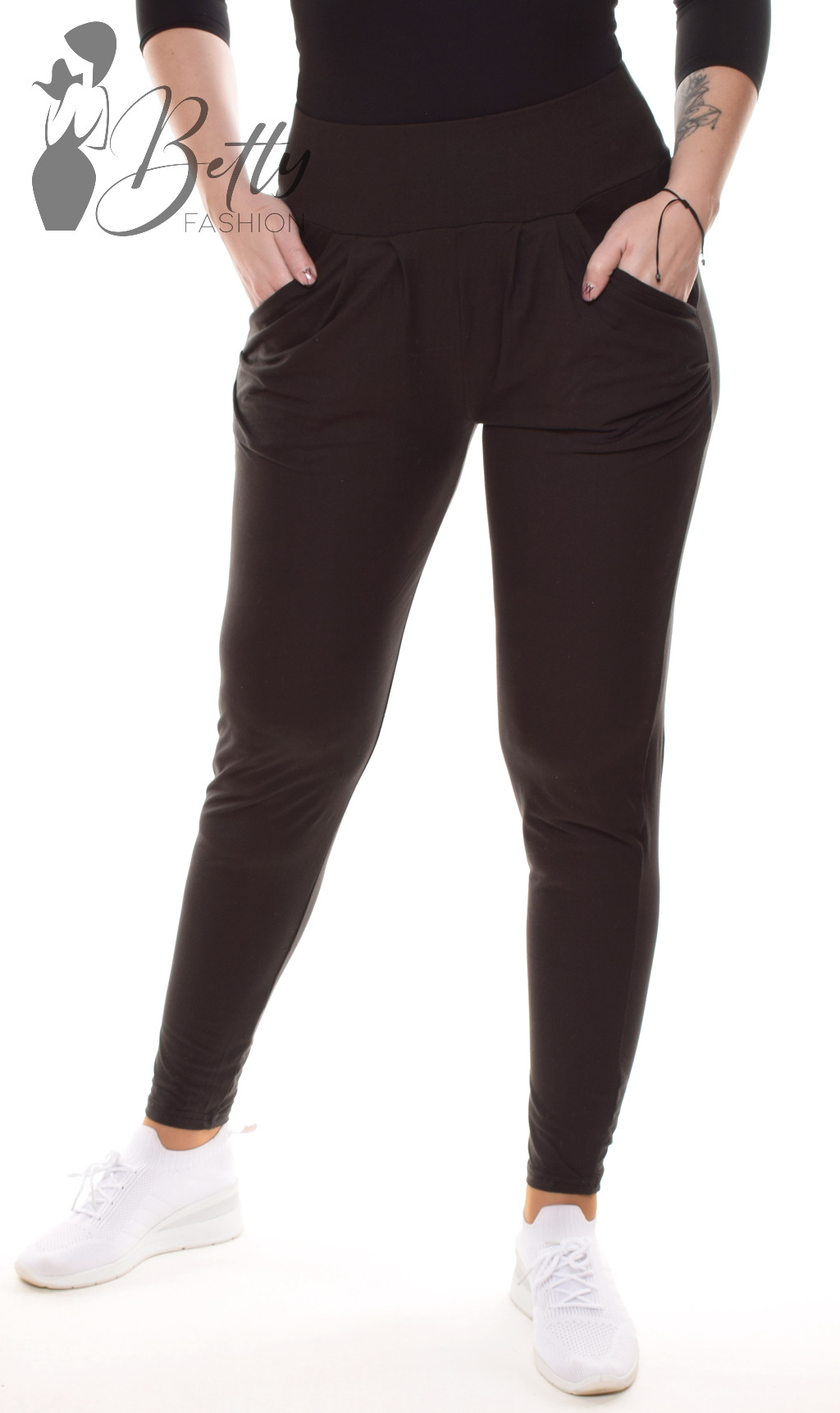 • Egyszínű, gumis és rakott derekú, elején zsebes nadrág