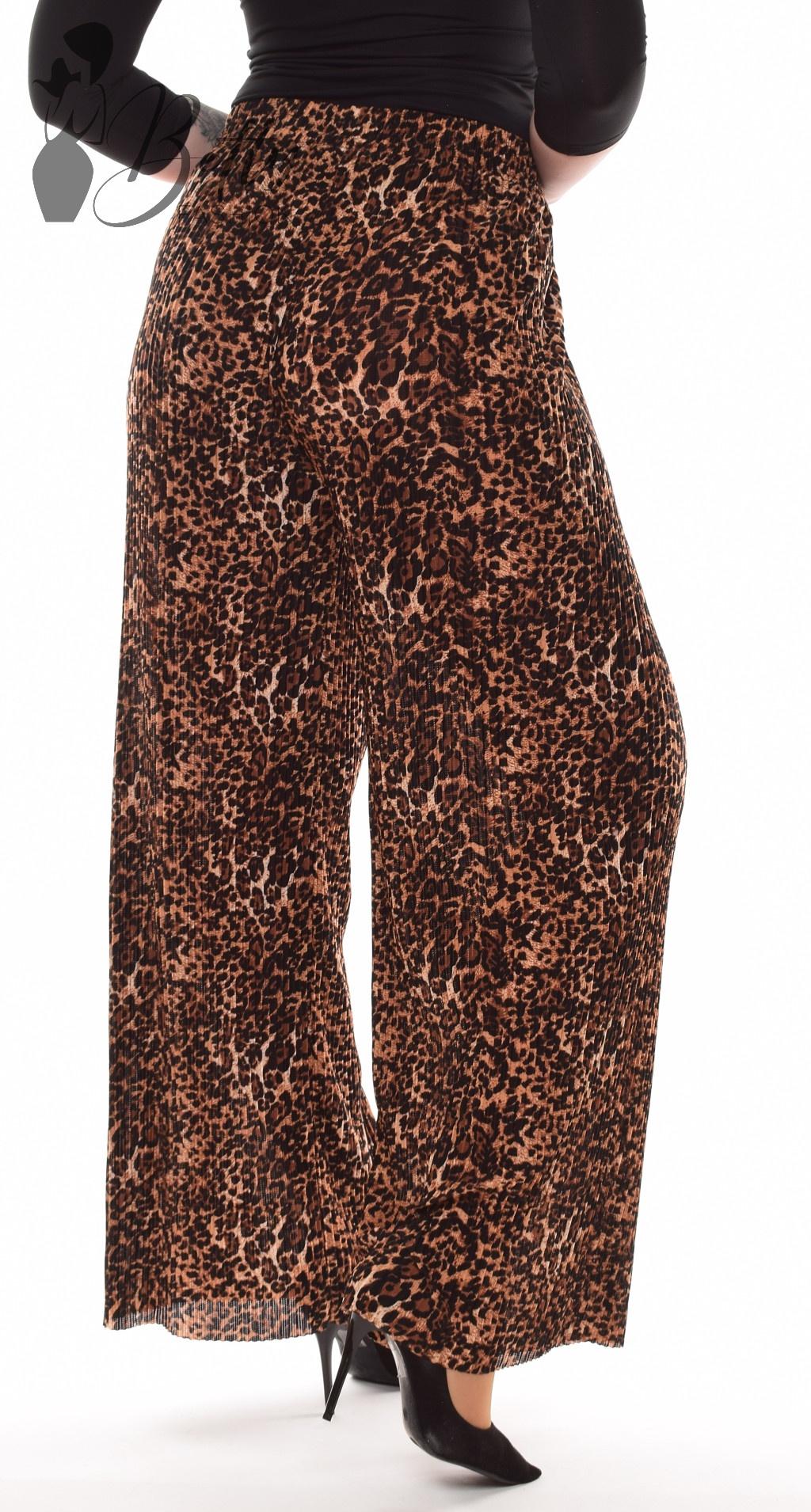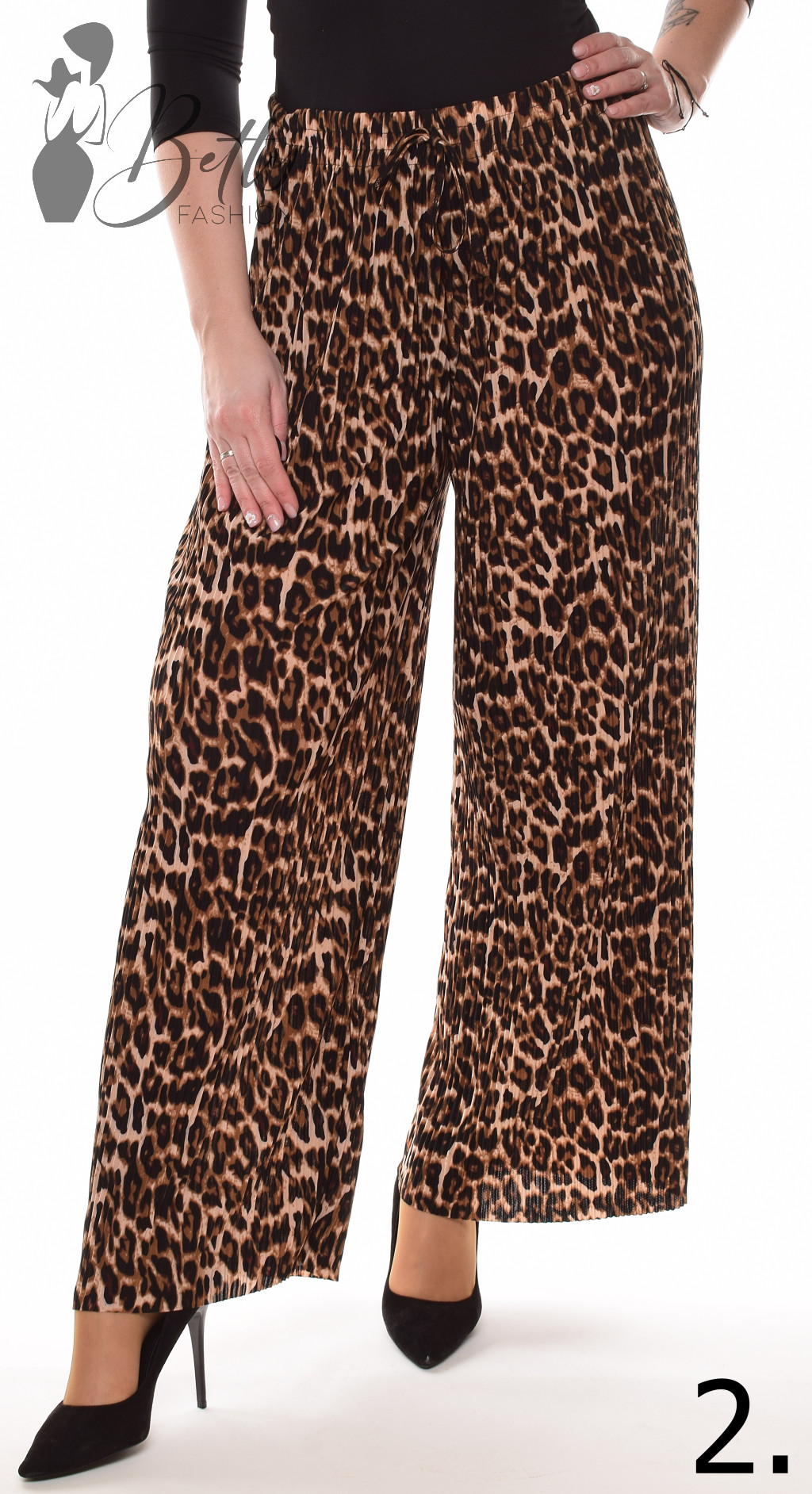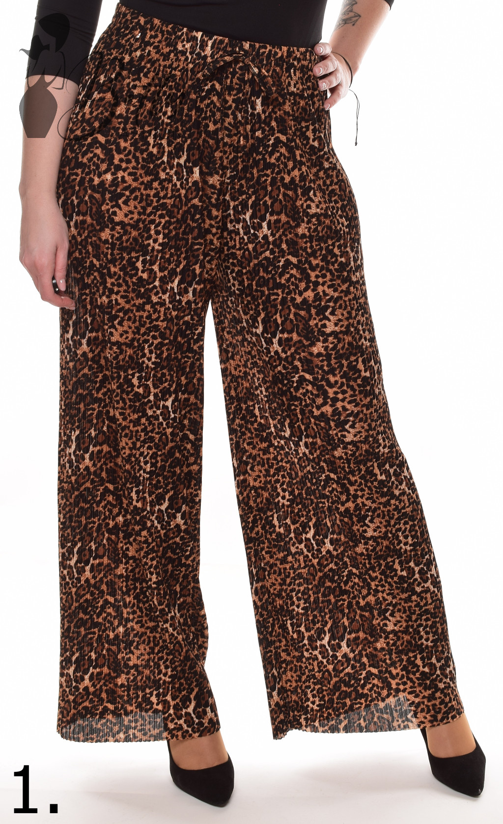 • Leopárd mintás, széles gumis derekú, plisszírozott és lenge anyagú, bő szárú nadrág