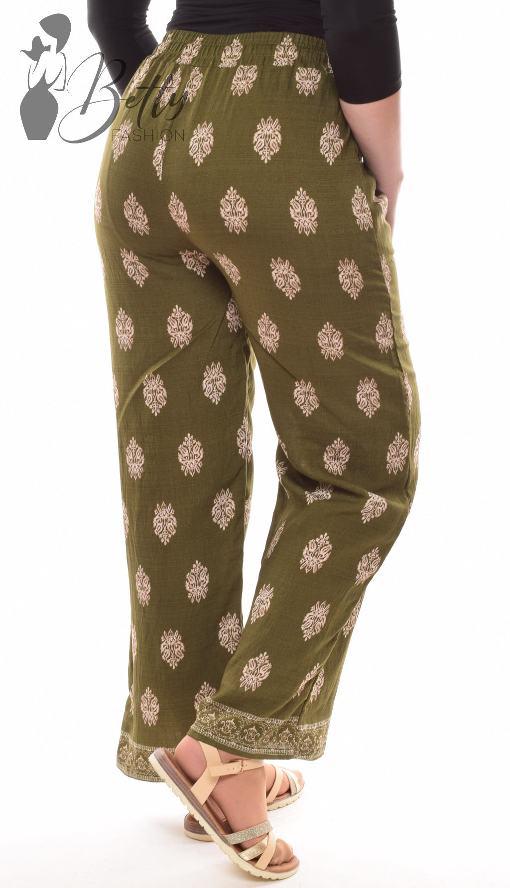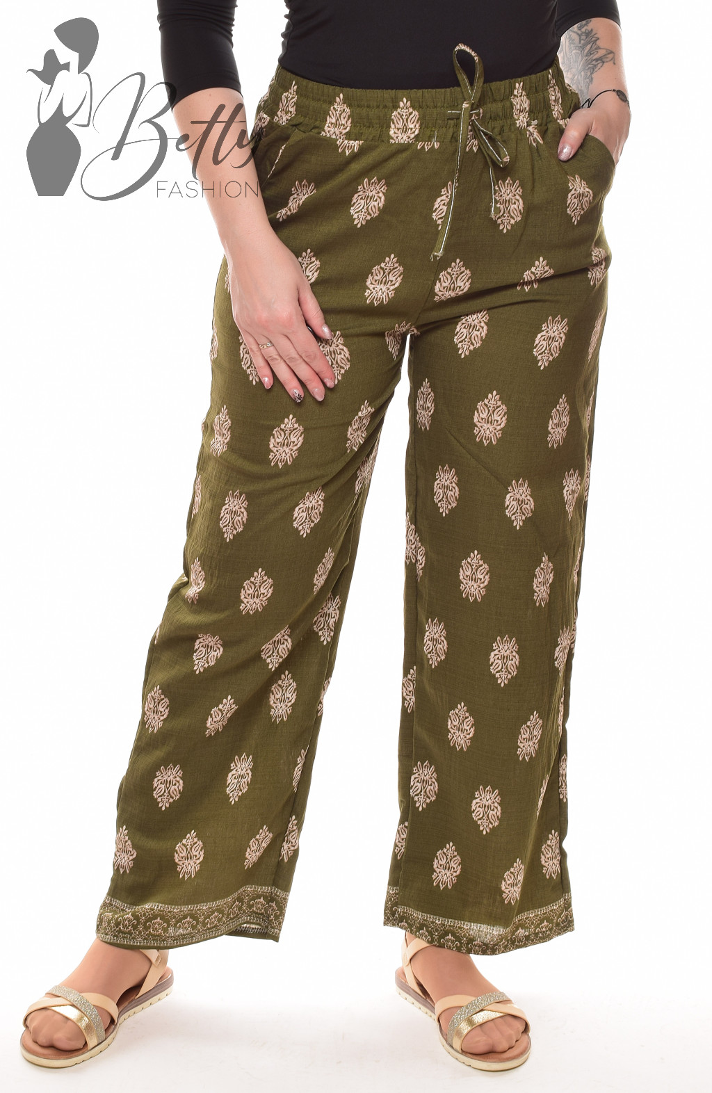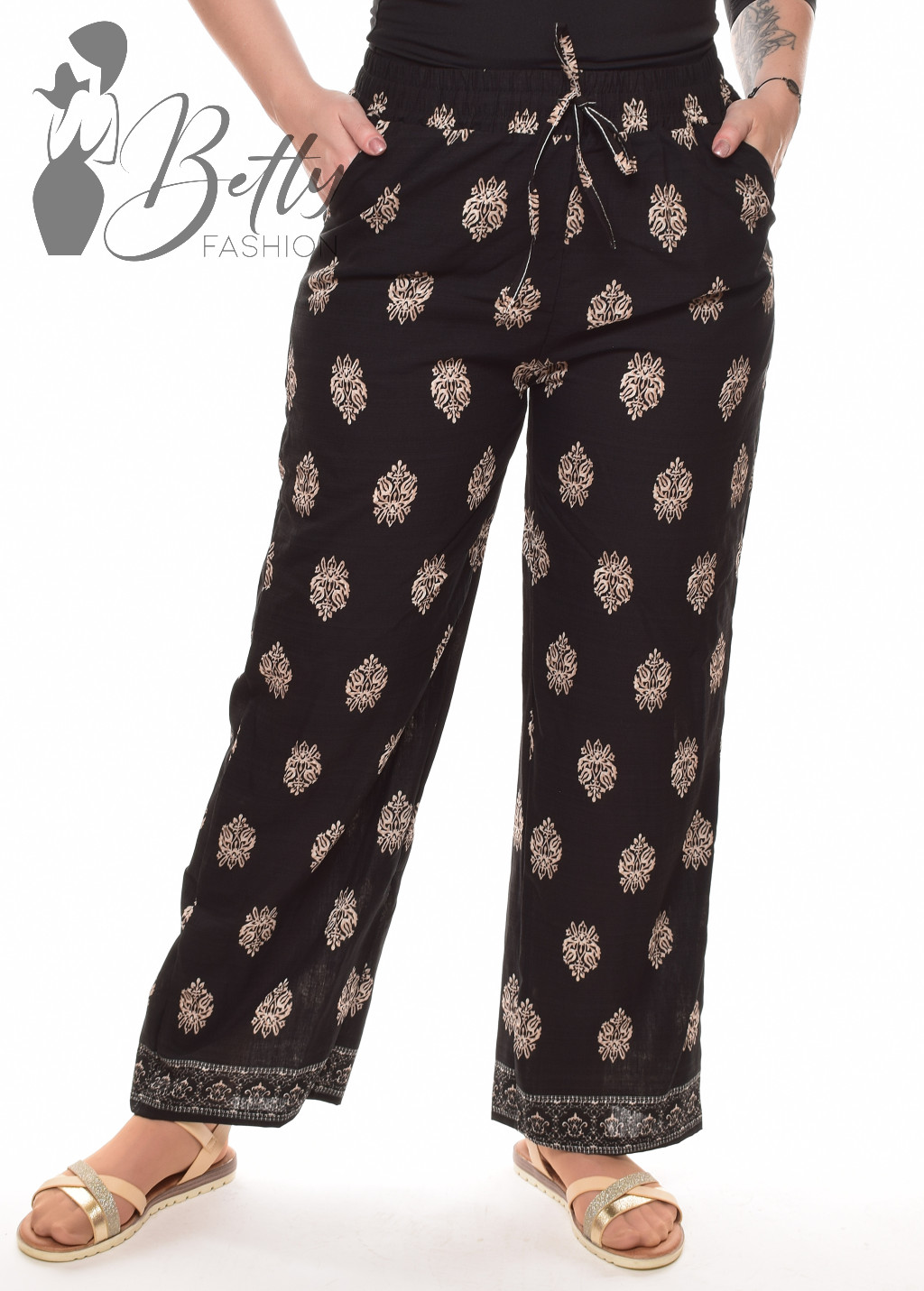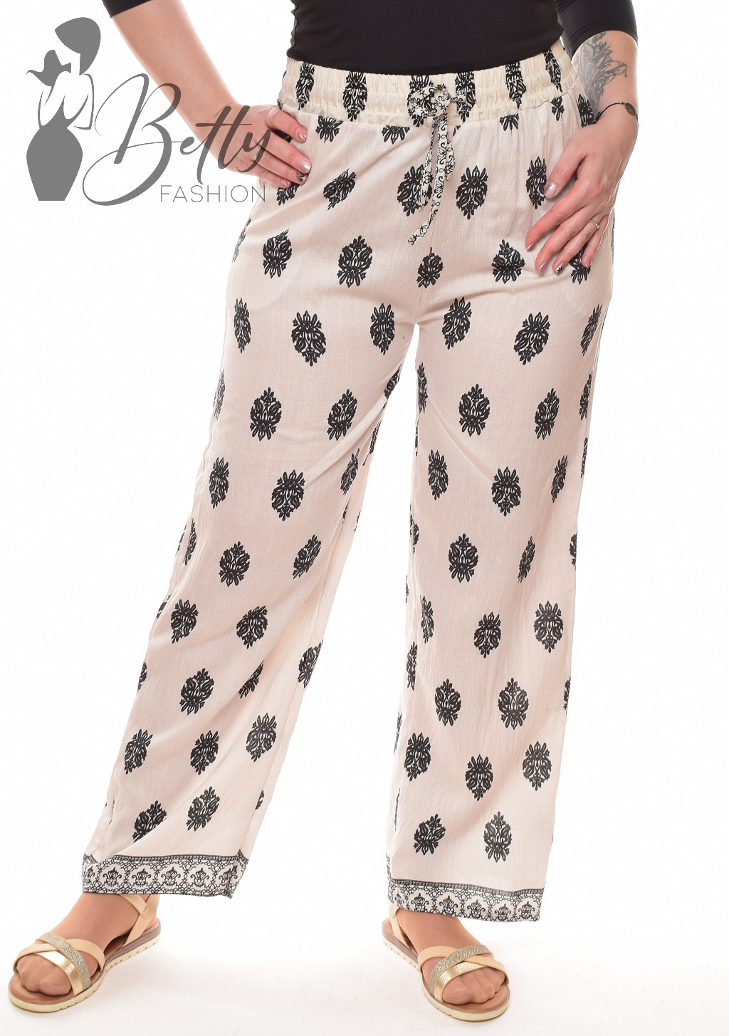 • Mintás, megkötős és gumis derekú, zsebes, bő szárú lenge nadrág