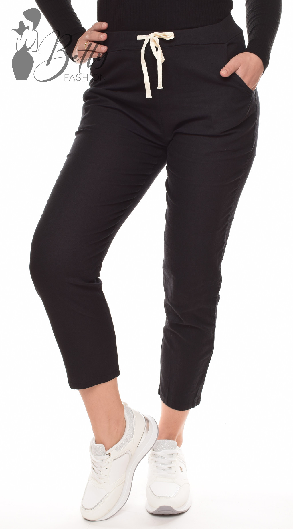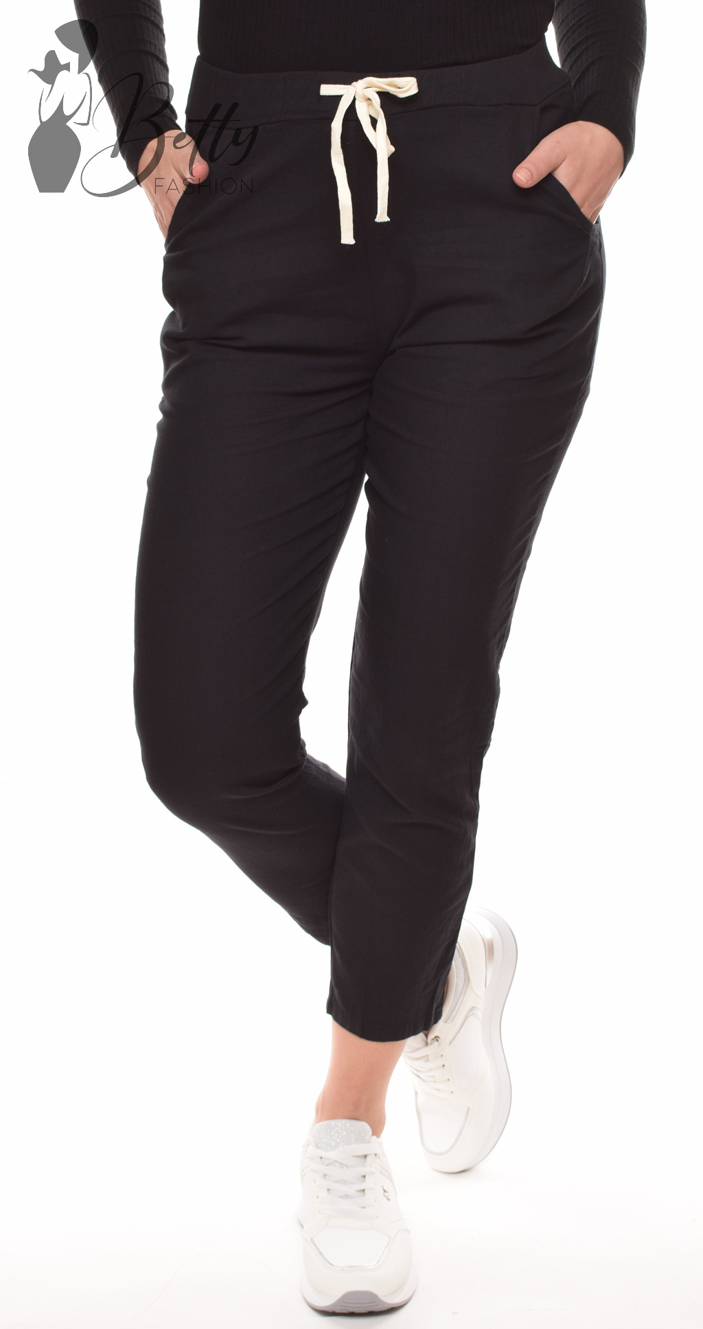 • Fekete színű, gumis és megkötős derekú, lenvászon nadrág