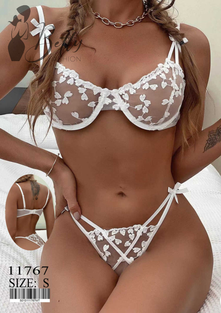 Fehér színű, tüll anyagon hímzett szívecske mintás erotikus szett. Részletgazdag kidolgozás.