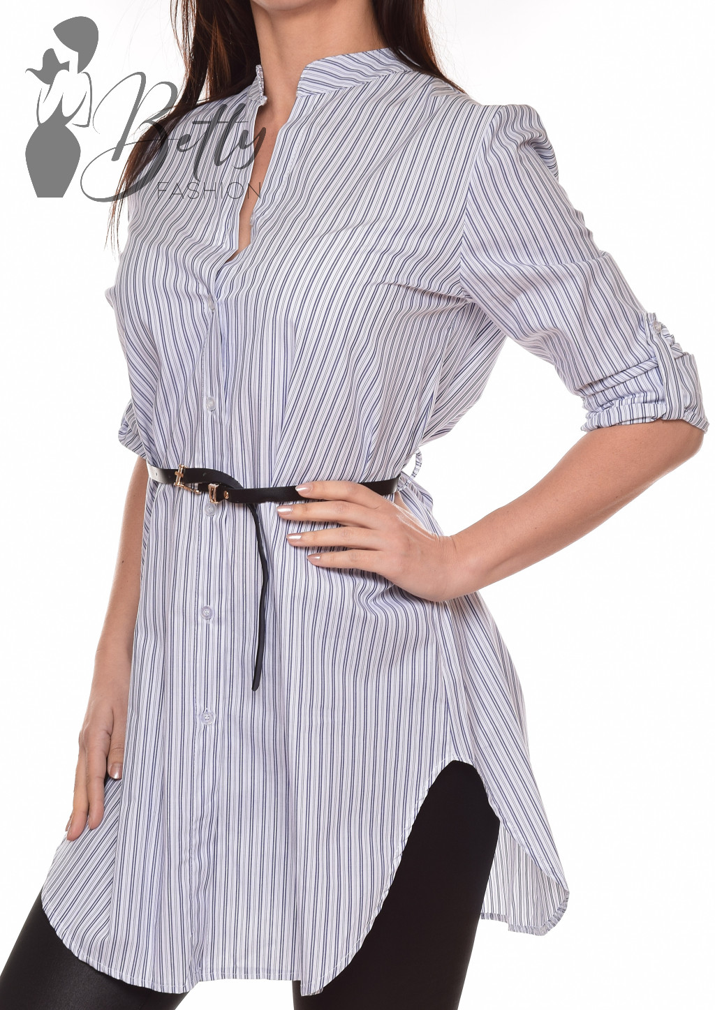 • Roll-up ujjú, állógalléros, sötétkék csillogó csíkos ing-tunika