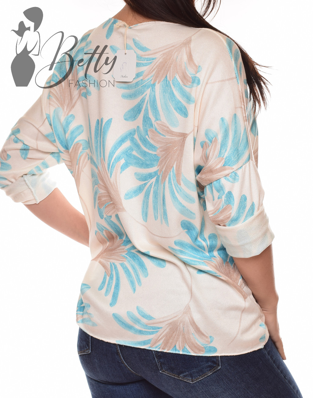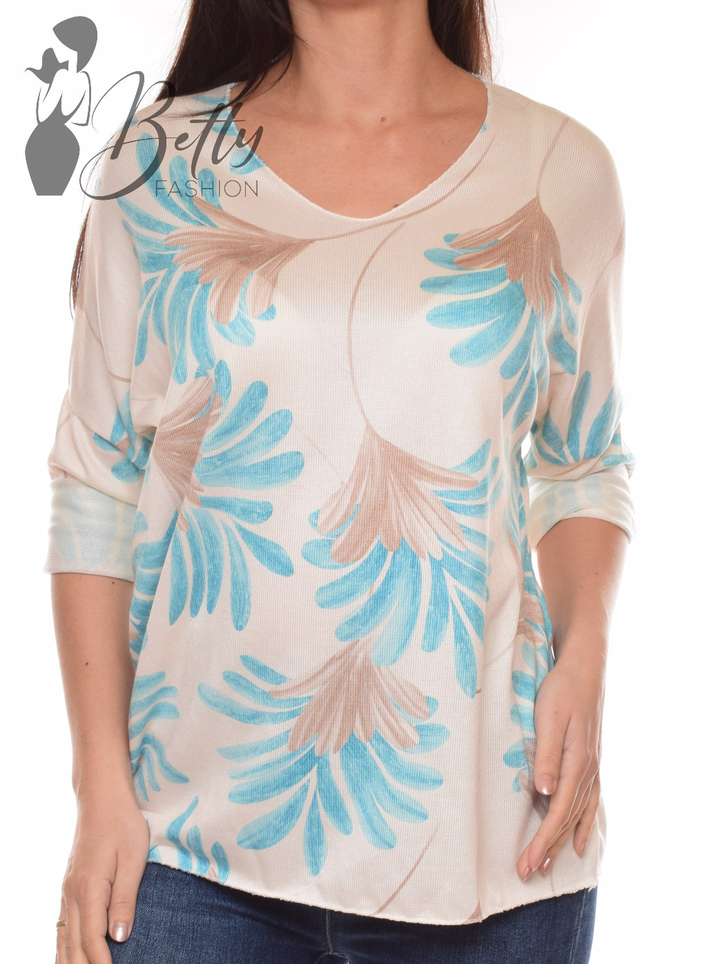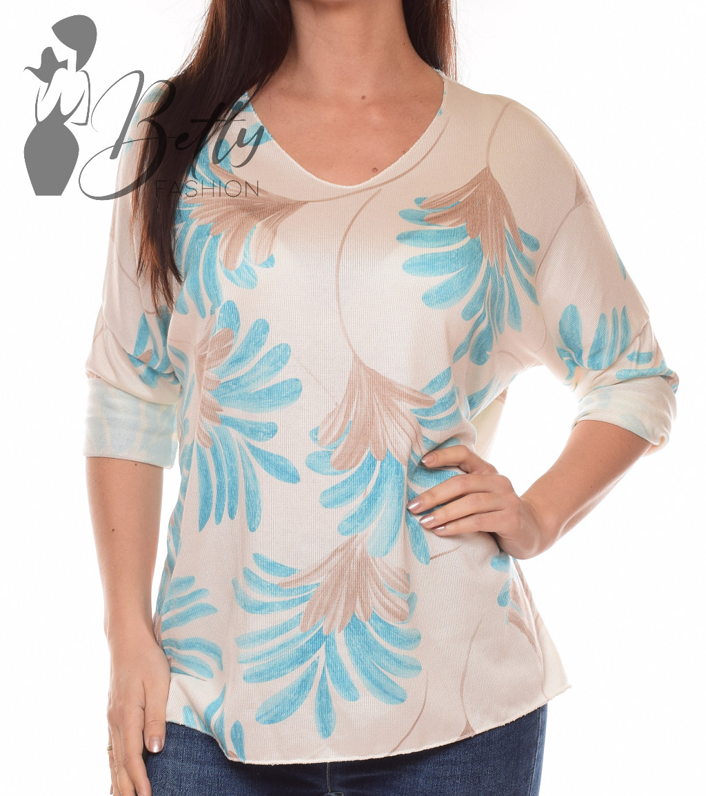 • V-kivágású, türkiz virágmintás, puha anyagú, laza fazonú tavaszi felső