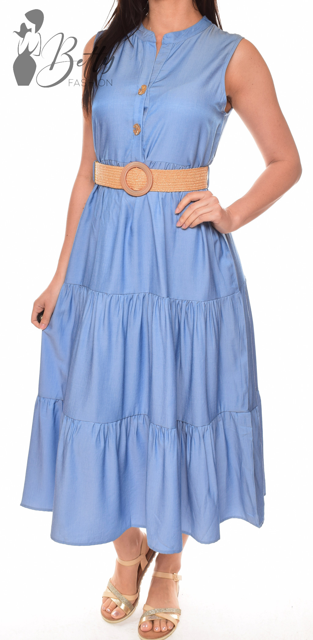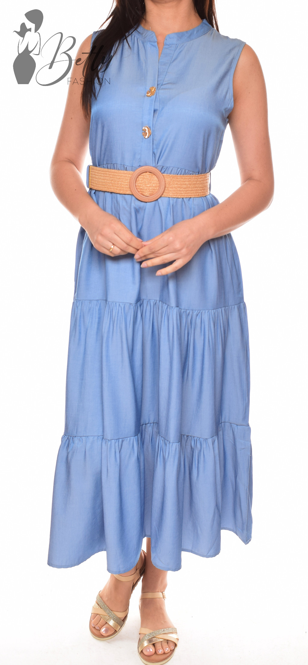 • Farmerkék színű, mellnél gombos, derékban fonott öves maxiruha