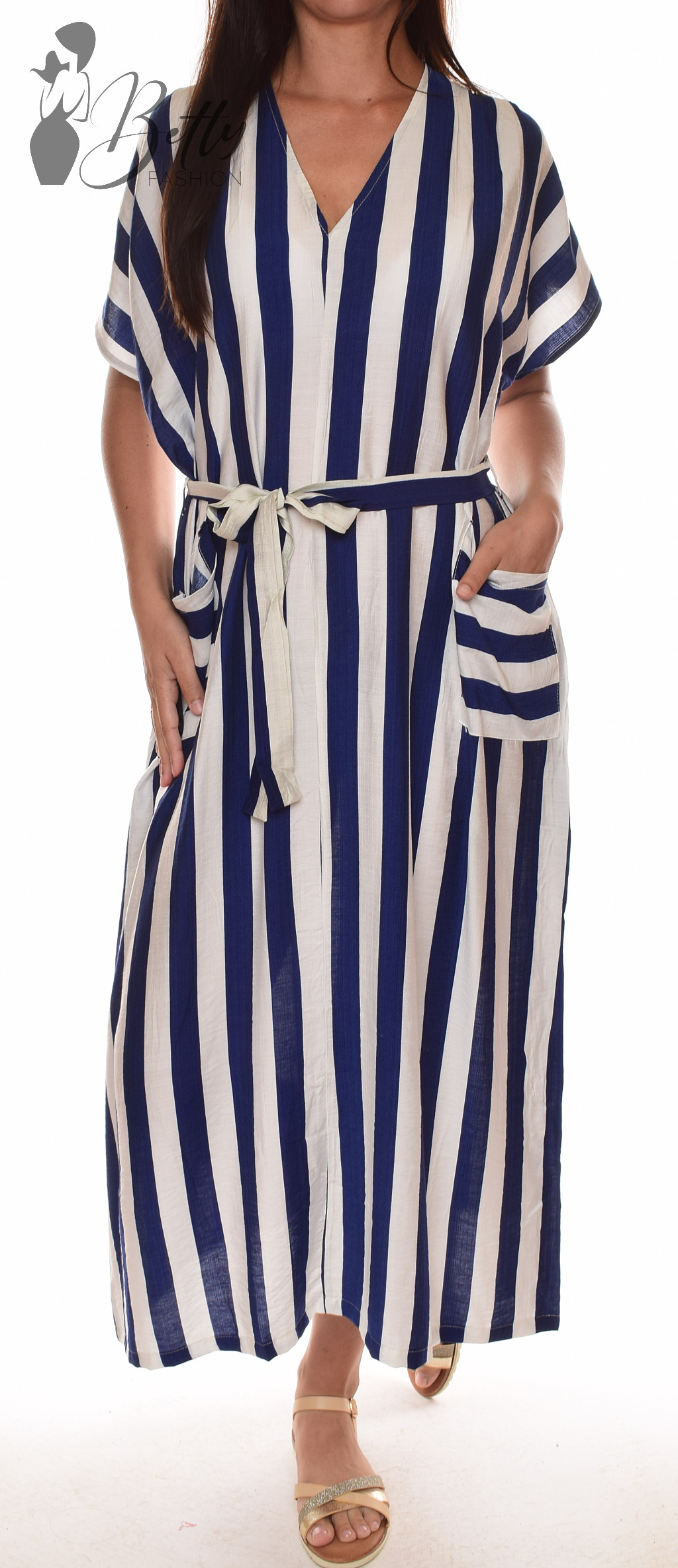 • V-kivágású, rövid ujjú, bő szabású, csíkos ruha