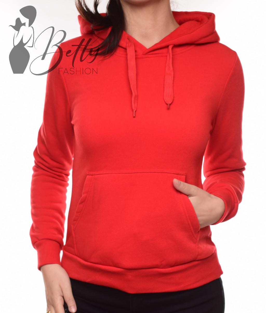 • Piros színű, kenguruzsebes, kapucnis pulóver