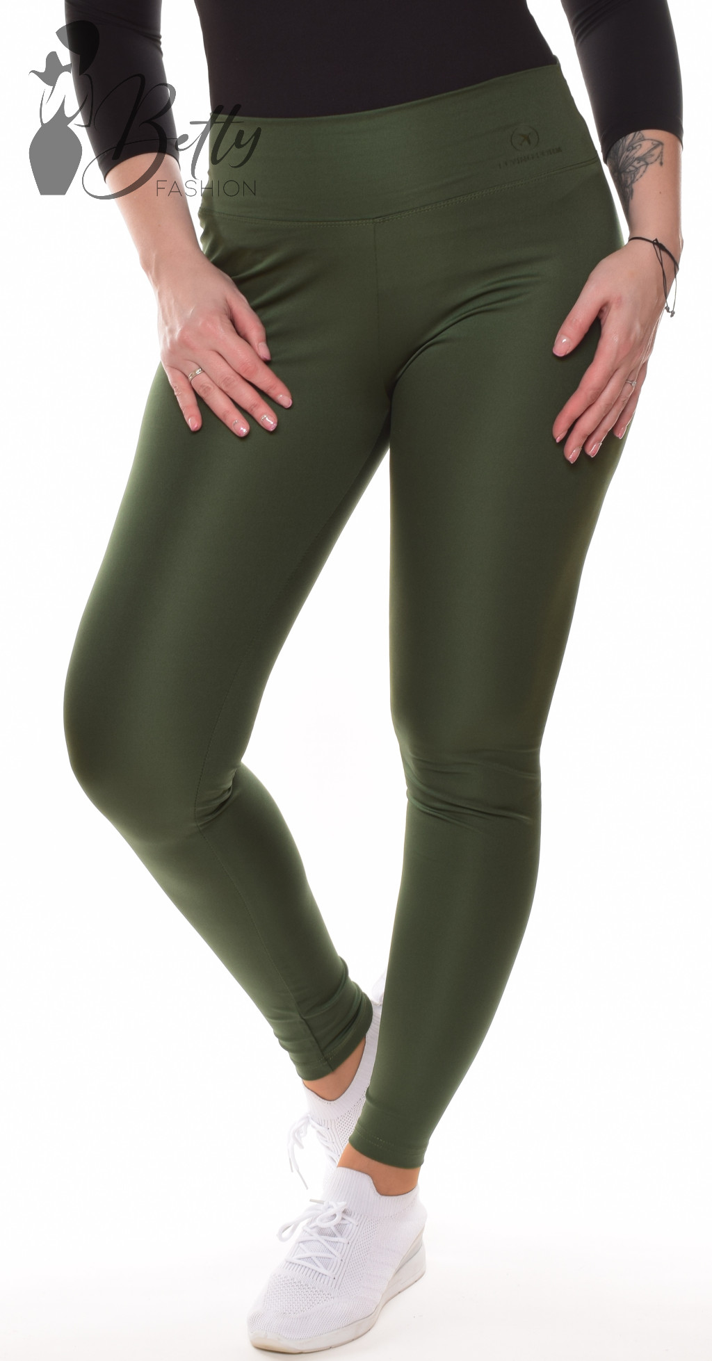 Sötétzöld színű, gumis derekú, derekán feliratos leggings