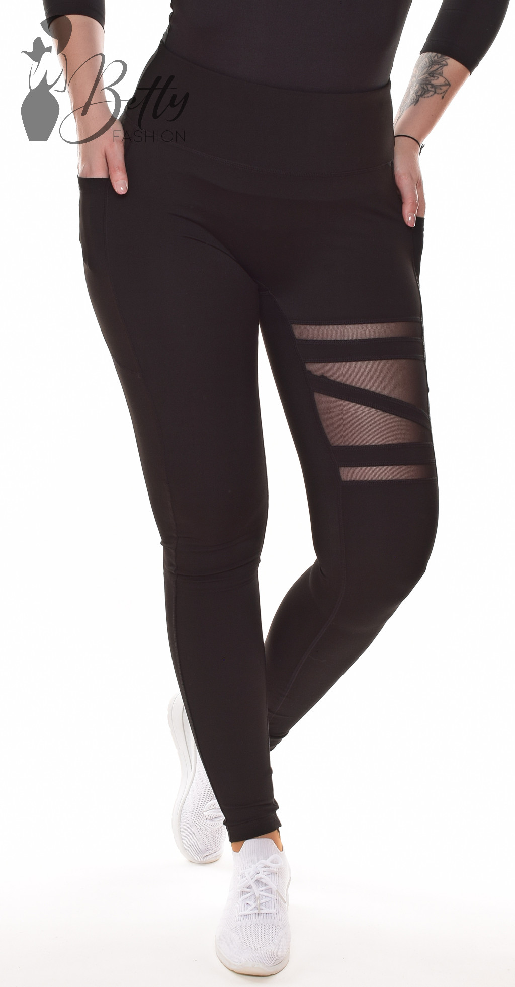 Bal szárán tüllbetétes, fekete sport legging S/M, L/XL, XL/2XL