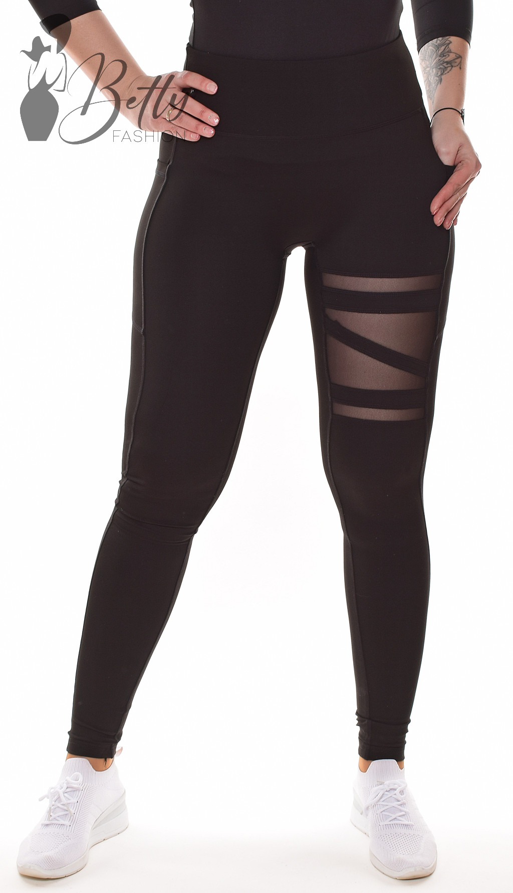 Fekete színű, gumis derekú, bal szárán tüllbetétes sport legging