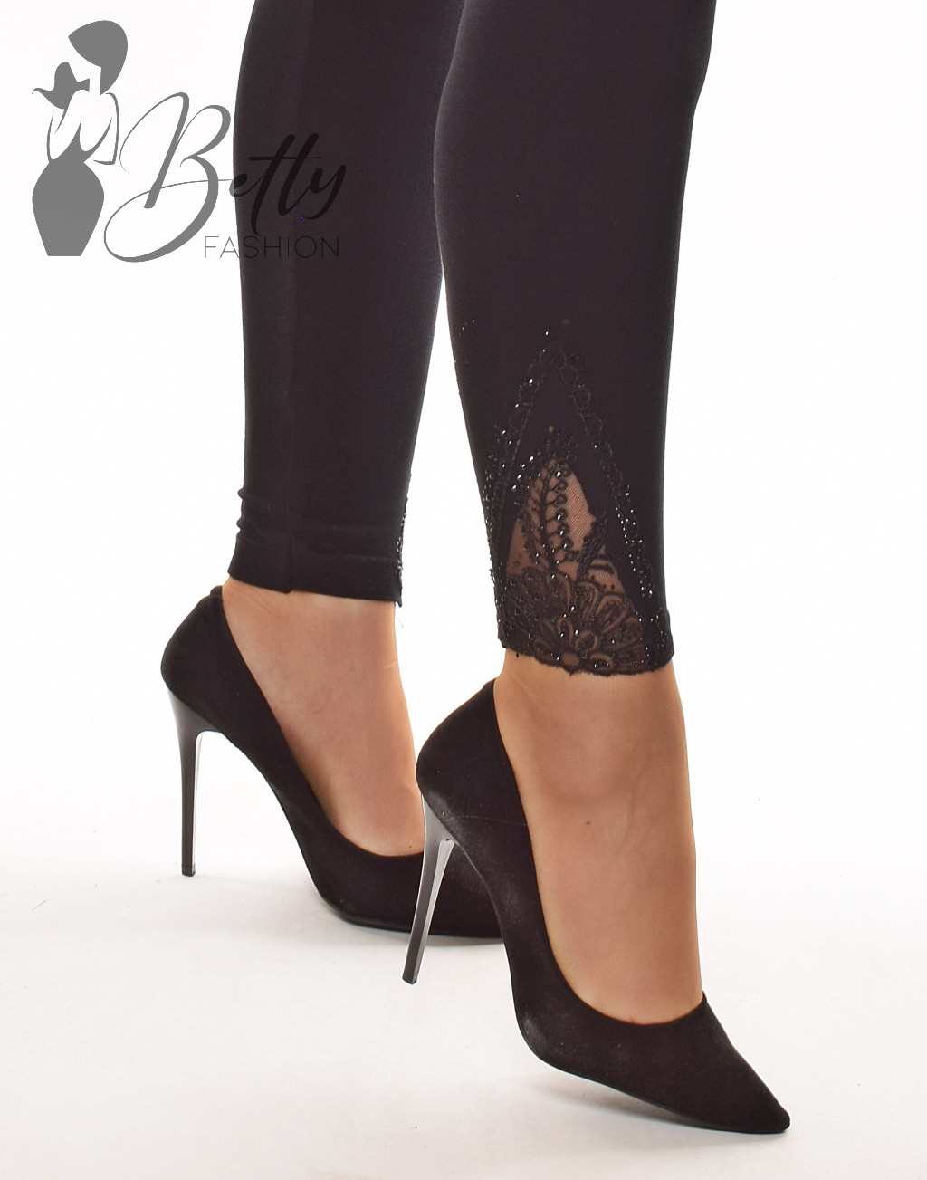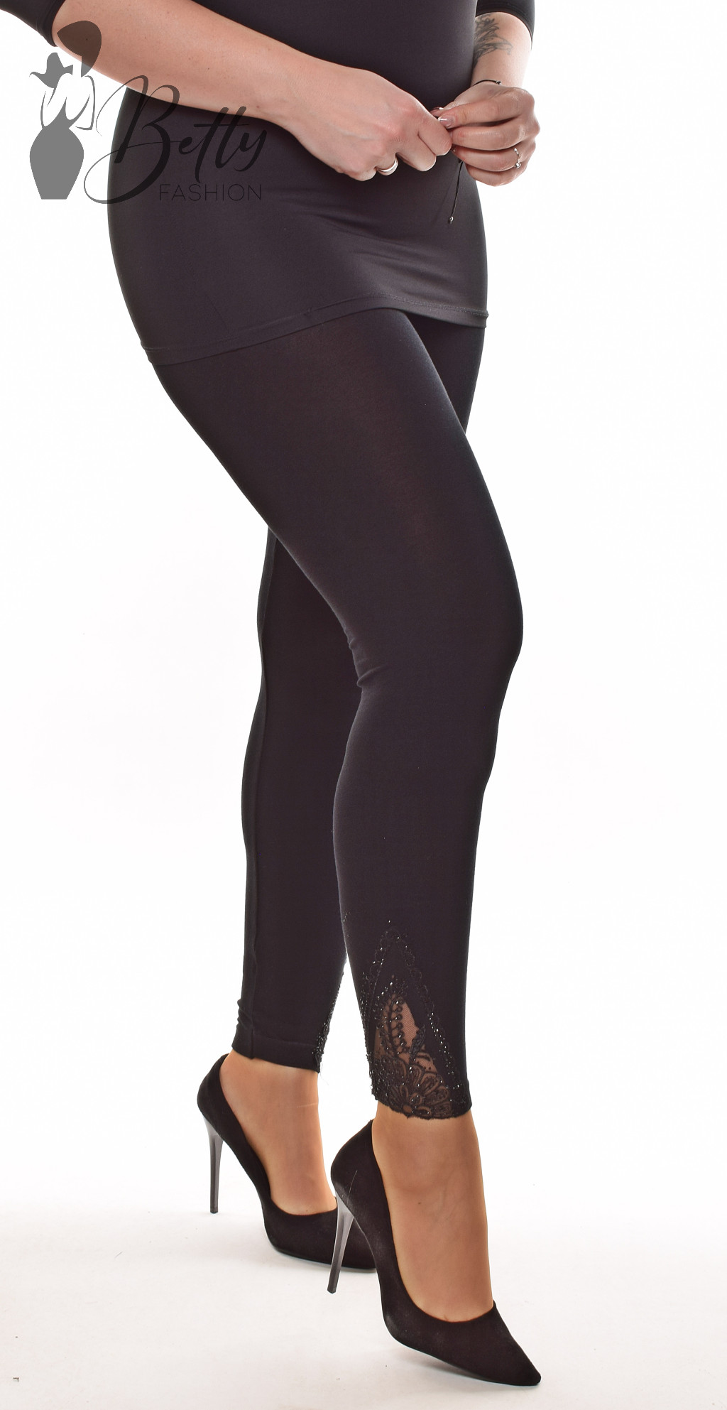 Gumis derekú, szára végén csipkebetétes és strasszköves fekete legging