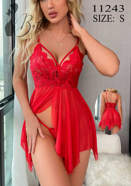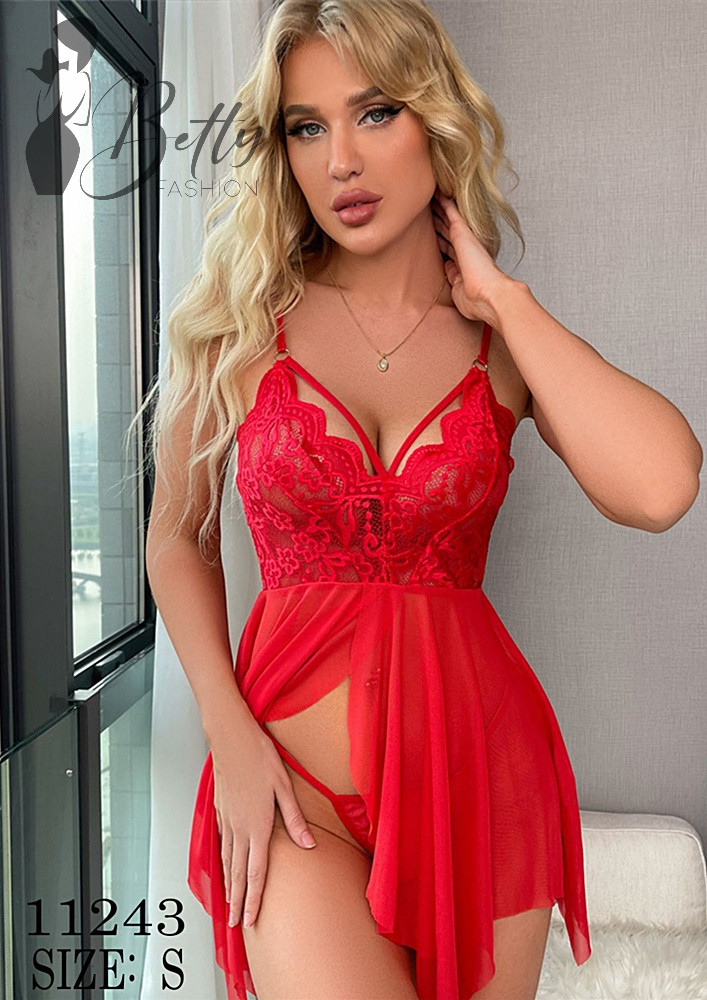Piros színű, kétrészes, csipkés és tüllös erotikus szett - S, M, L