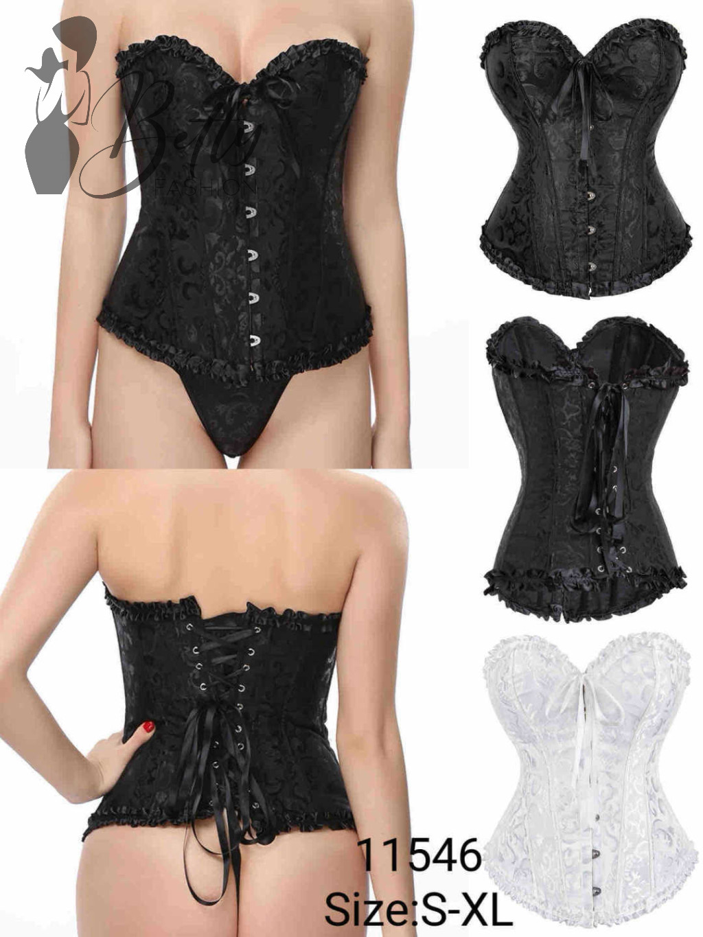 Fekete színű, brokát mintás erotikus szett, fodros szegéllyel. Részletgazdag, minőségi kidolgozás.