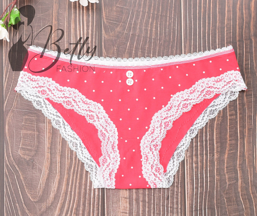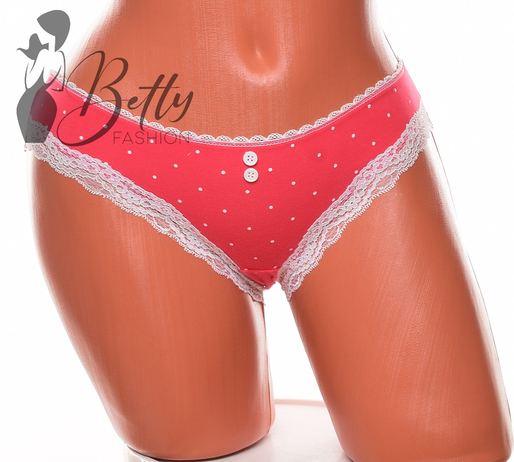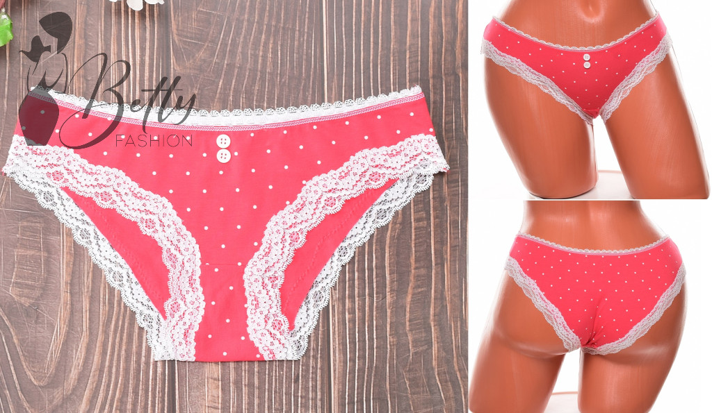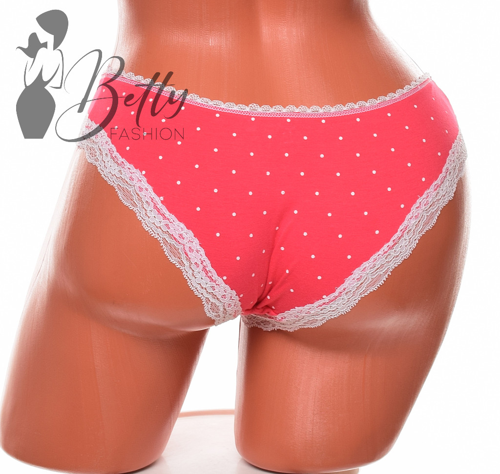 Pink színű, apró pöttyös, csipke szegélyes, normál fazonú bugyi