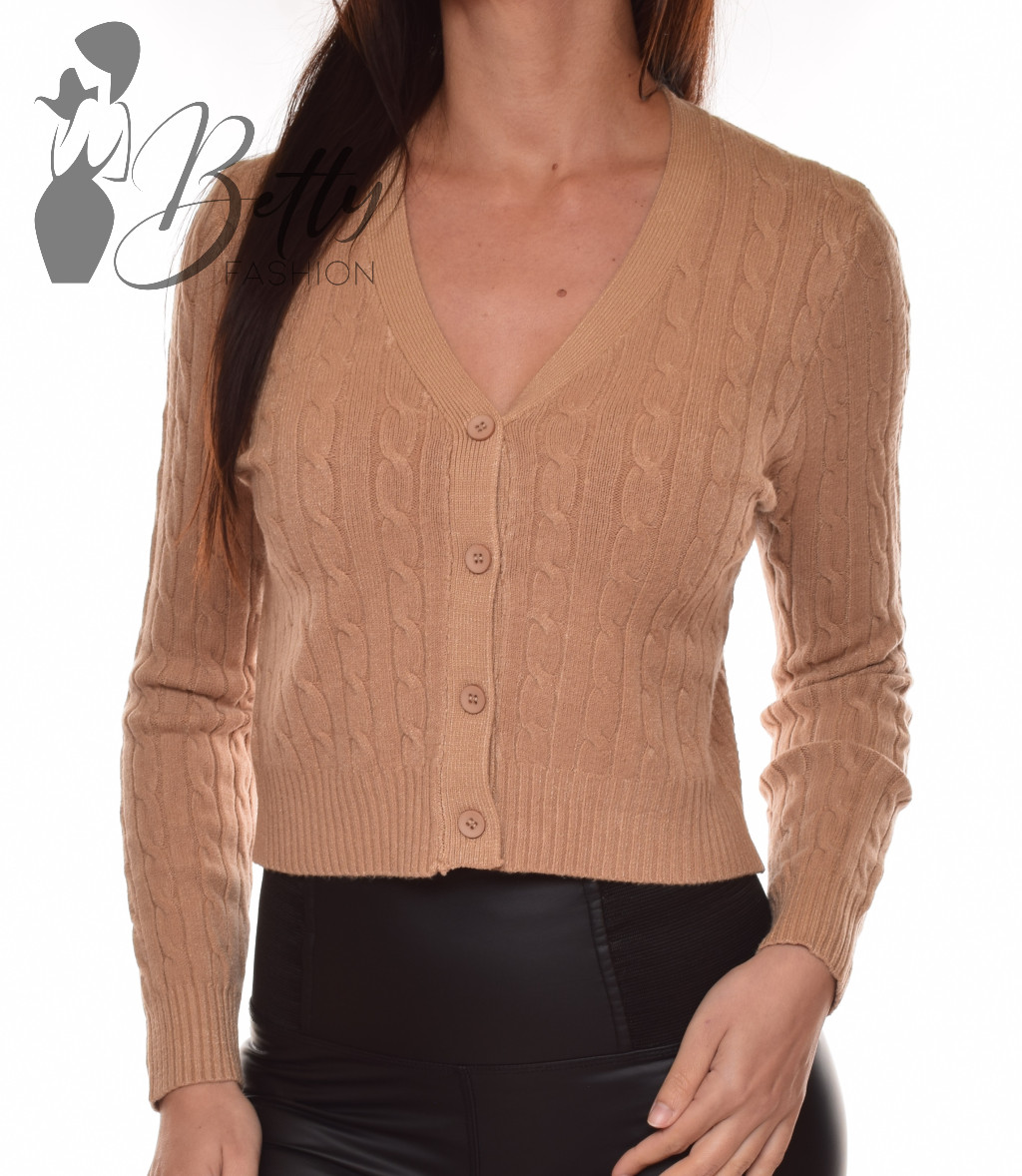 V-kivágású, gombos, anyagában csavart mintás, rövidebb fazonú kardigán
