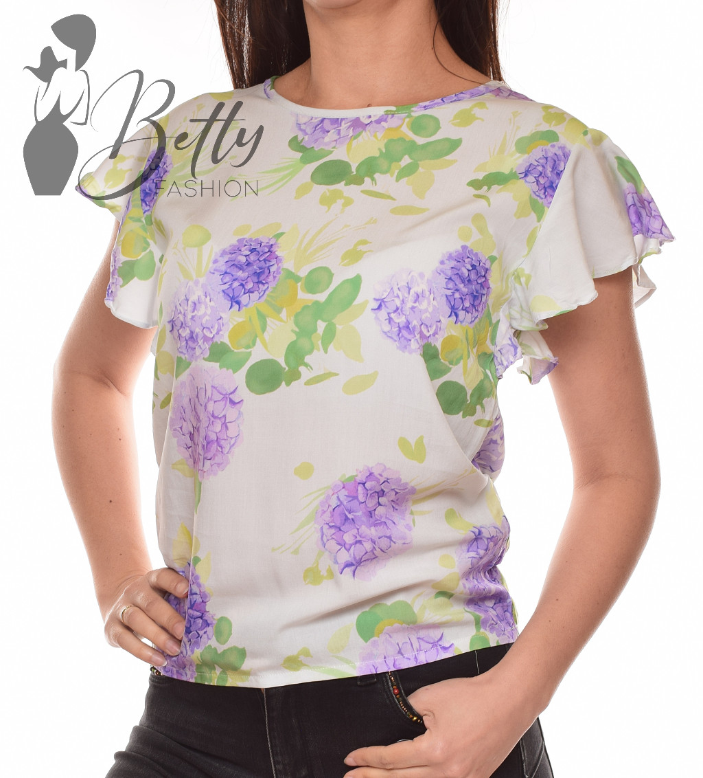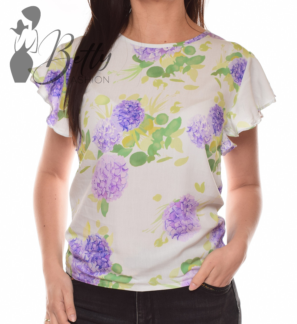 Fehér alapon orgona mintás, fodros ujjú, laza fazonú felső