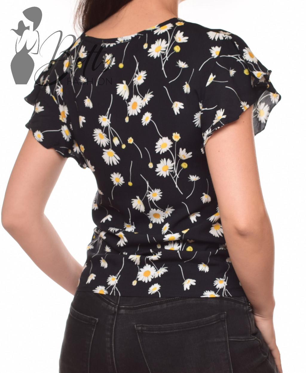 Fekete alapon margaréta mintás, fodros ujjú felső S, M, L, XL